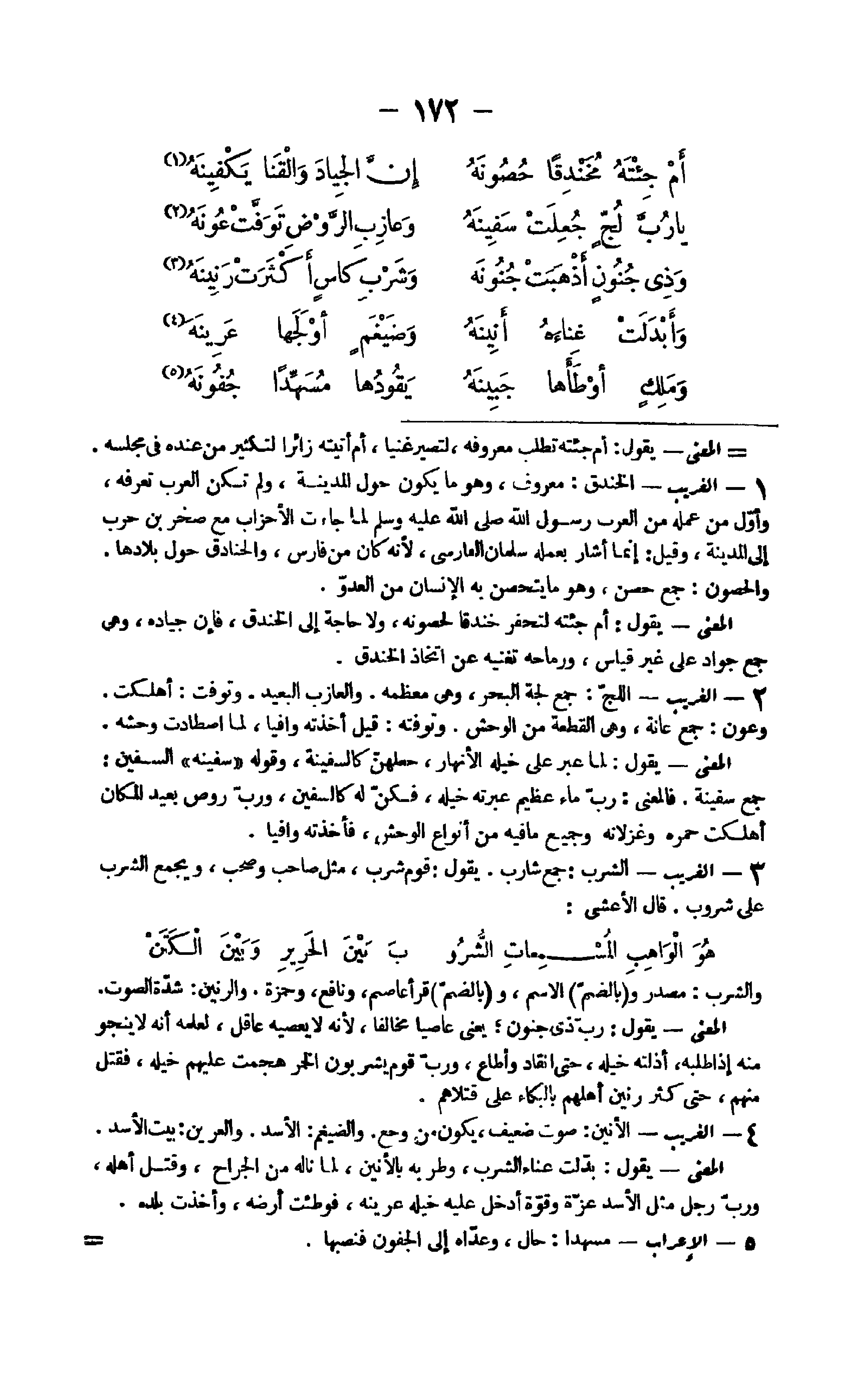 5 - الْغَرِيب اللج جمع لجة الْبَحْر وَهِي معظمه والعازب الْبعيد وتوفت أهلكت وَعون جمع عانة وَهِي الْقطعَة من الْوَحْش وتوفته قيل أَخَذته وافيا لما اصطادت وحشه الْمَعْنى يَقُول لما عبر عَليّ خيله الْأَنْهَار جعلن كالسفينة وَقَوله سَفِينِهِ السفين جَمِيع سفينة فَالْمَعْنى رب مَاء عَظِيم عبرته خيله فَكُن لَهُ كالسفين وَرب روض بعيد الْمَكَان أهلكت حمره وغزلانه وَجَمِيع مَا فِيهِ من أَنْوَاع الْوَحْش فَأَخَذته وافيا