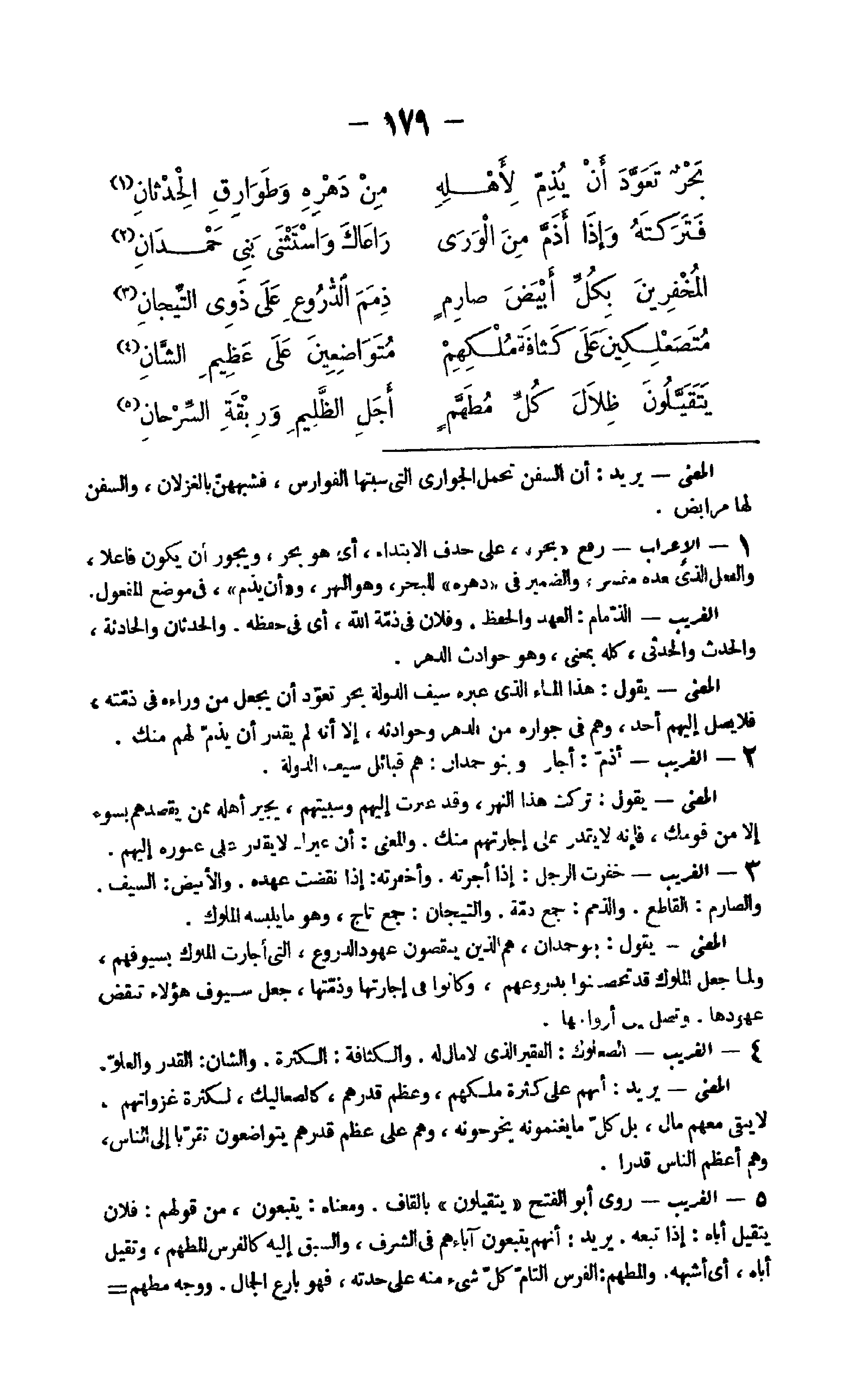 24 - الْإِعْرَاب رفع بَحر على حذف الِابْتِدَاء أَي هُوَ بَحر وَيجوز أَن يكون فَاعِلا وَالْفِعْل الَّذِي بعده مُفَسّر وَالضَّمِير فِي دهره للبحر وَهُوَ النَّهر وَأَن يذم فِي مَوضِع الْمَفْعُول الْغَرِيب الذمام الْعَهْد وَالْحِفْظ وَفُلَان فِي ذمَّة الله أَي فِي حفظه والحدثان والحادثة وَالْحَدَث والحدثي كُله بِمَعْنى وَهُوَ حوادث الدَّهْر الْمَعْنى يَقُول هَذَا المَاء الَّذِي عبره سيف الدولة بَحر تعود أَن يَجْعَل من وَرَاءه فِي ذمَّته فَلَا يصل إِلَيْهِم أحد وهم فِي جواره من الدَّهْر وحوادثه إِلَّا إِنَّه لم يقدر أَن يذم لَهُم مِنْك