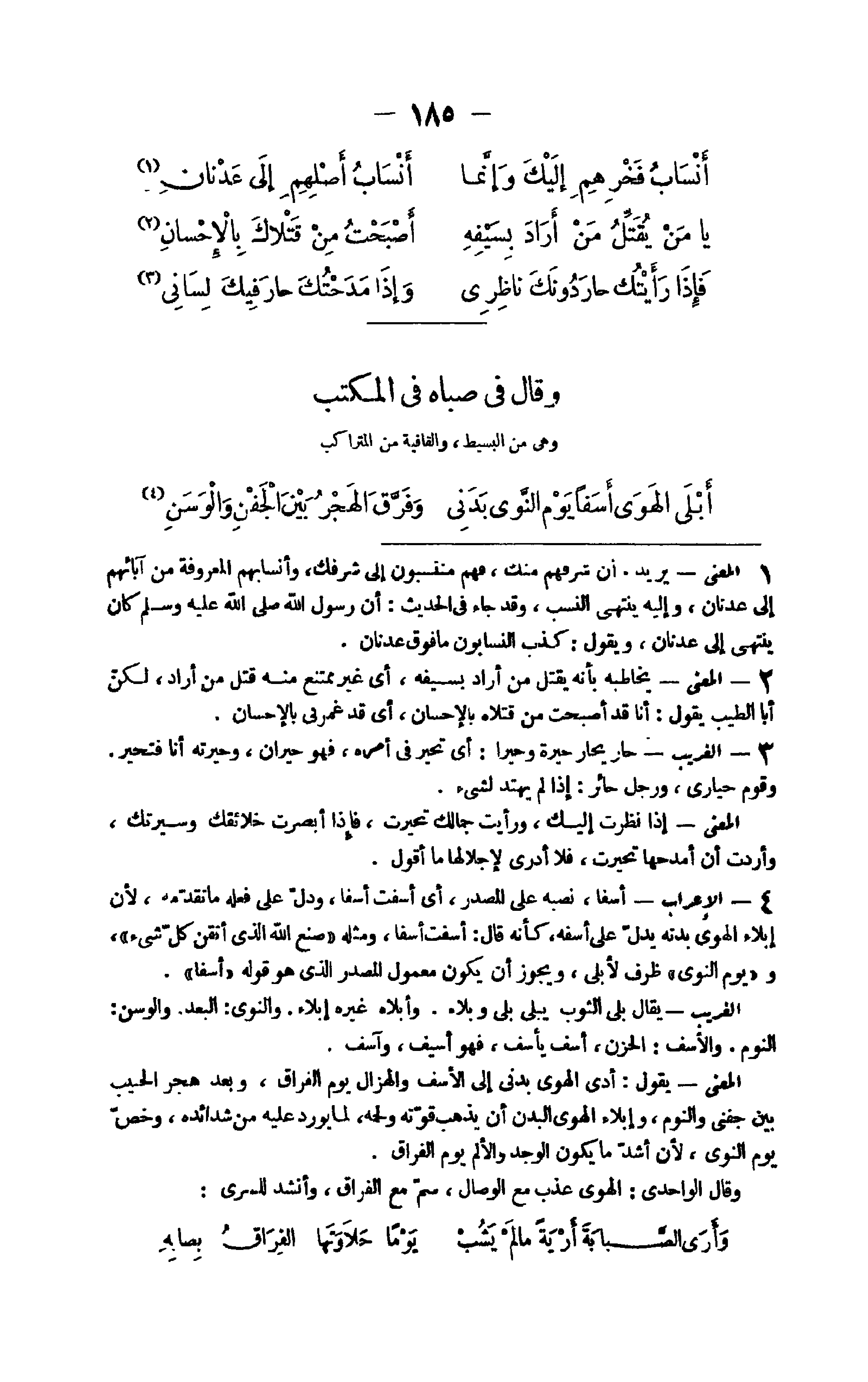 - 1 الْإِعْرَاب أسفا نَصبه على الْمصدر أَي أسفت أسفا وَدلّ على فعله مَا تقدمه لِأَن إبلاء الْهوى يدل بدنه على أسفه كَأَنَّهُ قَالَ أسفت أسفا وَمثله صنع الله الَّذِي أتقن كل شَيْء وَيَوْم النَّوَى ظرف لأبلى وَيجوز أَن يكون مَعْمُول الْمصدر الَّذِي هُوَ قَوْله أسفا الْغَرِيب يُقَال بلَى الثَّوْب يبْلى بلَى وبلاء وأبلاه غَيره إبلاء والنوى الْبعد والوسن النّوم والأسف الْحزن أَسف يأسف فَهُوَ أسيف وآسف الْمَعْنى يَقُول أدّى الْهوى بدني إِلَى الأسف والهزال يَوْم الْفِرَاق وَبعد هجر الحبيب بَين جفني وَالنَّوْم وإبلاء الْهوى الْبدن أَن يذهب قوته ولحمه لما يُورد عَلَيْهِ من شدائده وَخص يَوْم النَّوَى لِأَن أَشد مَا يكون الوجد والألم يَوْم الْفِرَاق وَقَالَ الواحدي الْهوى عذب مَعَ الْوِصَال سم مَعَ الْفِرَاق وَأنْشد للسرى