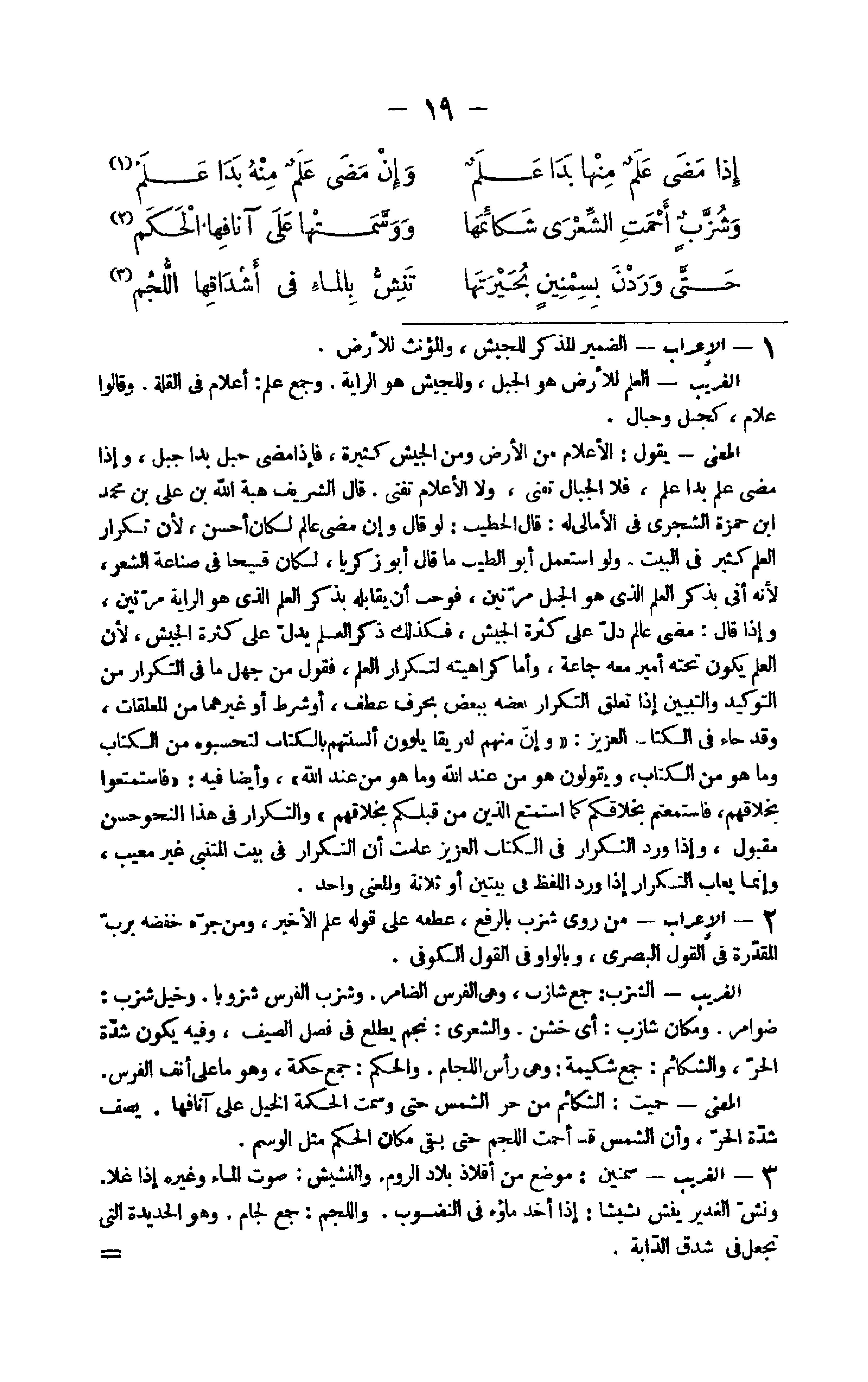19 - الْإِعْرَاب من روى شرب بِالرَّفْع عطفه على قَوْله علم الْأَخير وَمن جَرّه خفضه بِرَبّ الْمقدرَة فِي القَوْل الْبَصْرِيّ وبالواو فِي القَوْل الْكُوفِي الْغَرِيب الشّرْب جمع شَارِب وَهِي الْفرس الضامر وَشرب الْفرس شروبا وخيل شرب ضوامر وَمَكَان شازب أَي خشن والشعري نجم يطلع فِي فصل الصَّيف وَفِيه يكون شدَّة الْحر والشكائم جمع شكيمة وَهِي رَأس اللجام وَالْحكم جمع حِكْمَة وَهُوَ مَا على أنف الْفرس الْمَعْنى حميت الشكائم من حر الشَّمْس حَتَّى وسمت الْحِكْمَة الْخَيل على أنافها يصف شدَّة الْحر وَأَن الشَّمْس قد أحمت اللجم حَتَّى بقى مَكَان الحكم مثل الوسم