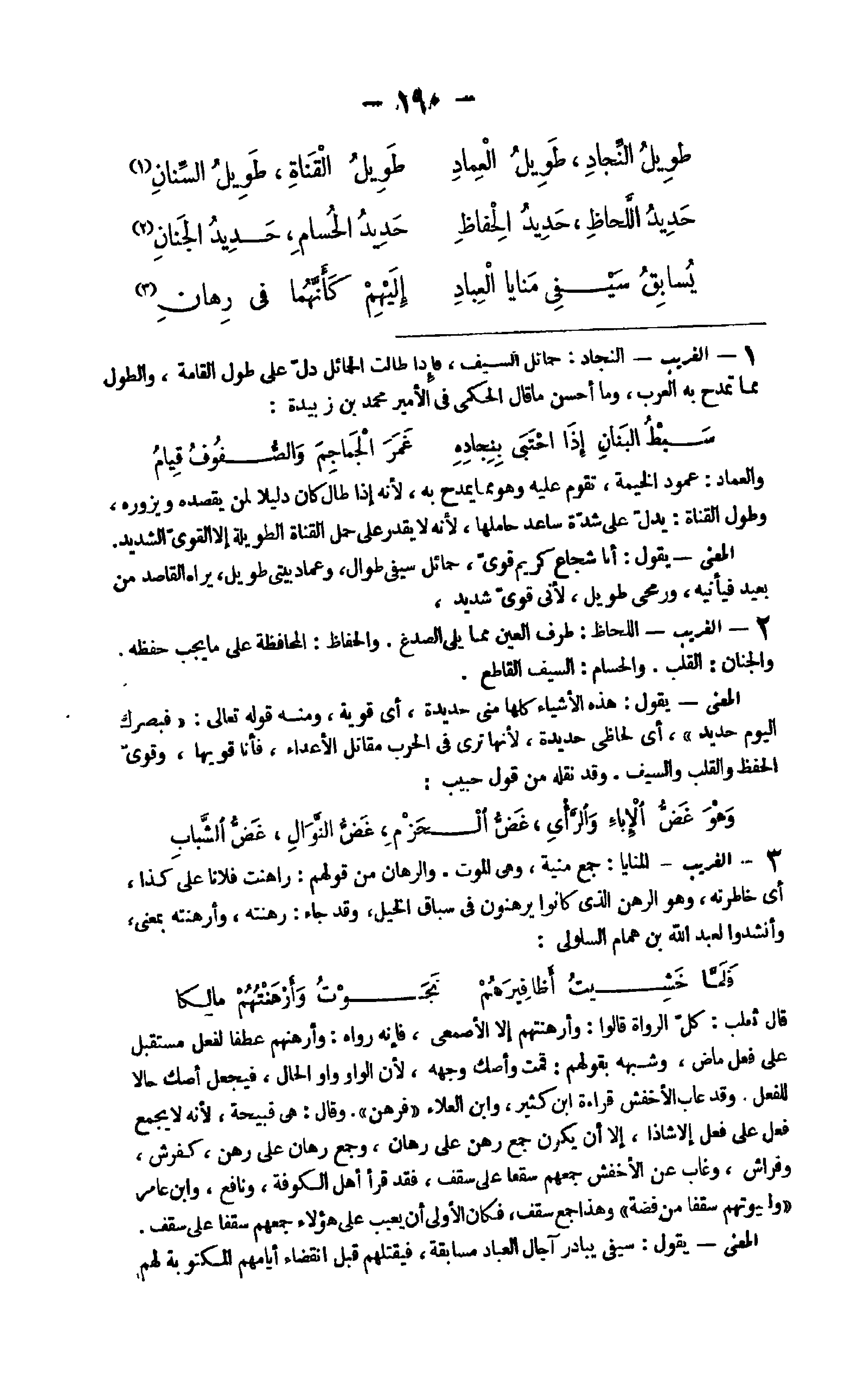 6 - الْغَرِيب اللحاظ طرف الْعين مِمَّا يَلِي الصدغ والحفاظ الْمُحَافظَة على مَا يجب حفظه والجنان الْقلب والحسام السَّيْف الْقَاطِع الْمَعْنى يَقُول هَذِه الْأَشْيَاء كلهَا مني حَدِيدَة أَي قويه وَمِنْه قَوْله تَعَالَى {فبصرك الْيَوْم حَدِيد} أَي لحاظي حَدِيدَة لِأَنَّهَا ترى فِي الْحَرْب مقَاتل الْأَعْدَاء فَأَنا قويها وقوى الْحِفْظ وَالْقلب وَالسيف وَقد نَقله من قَوْله حبيب