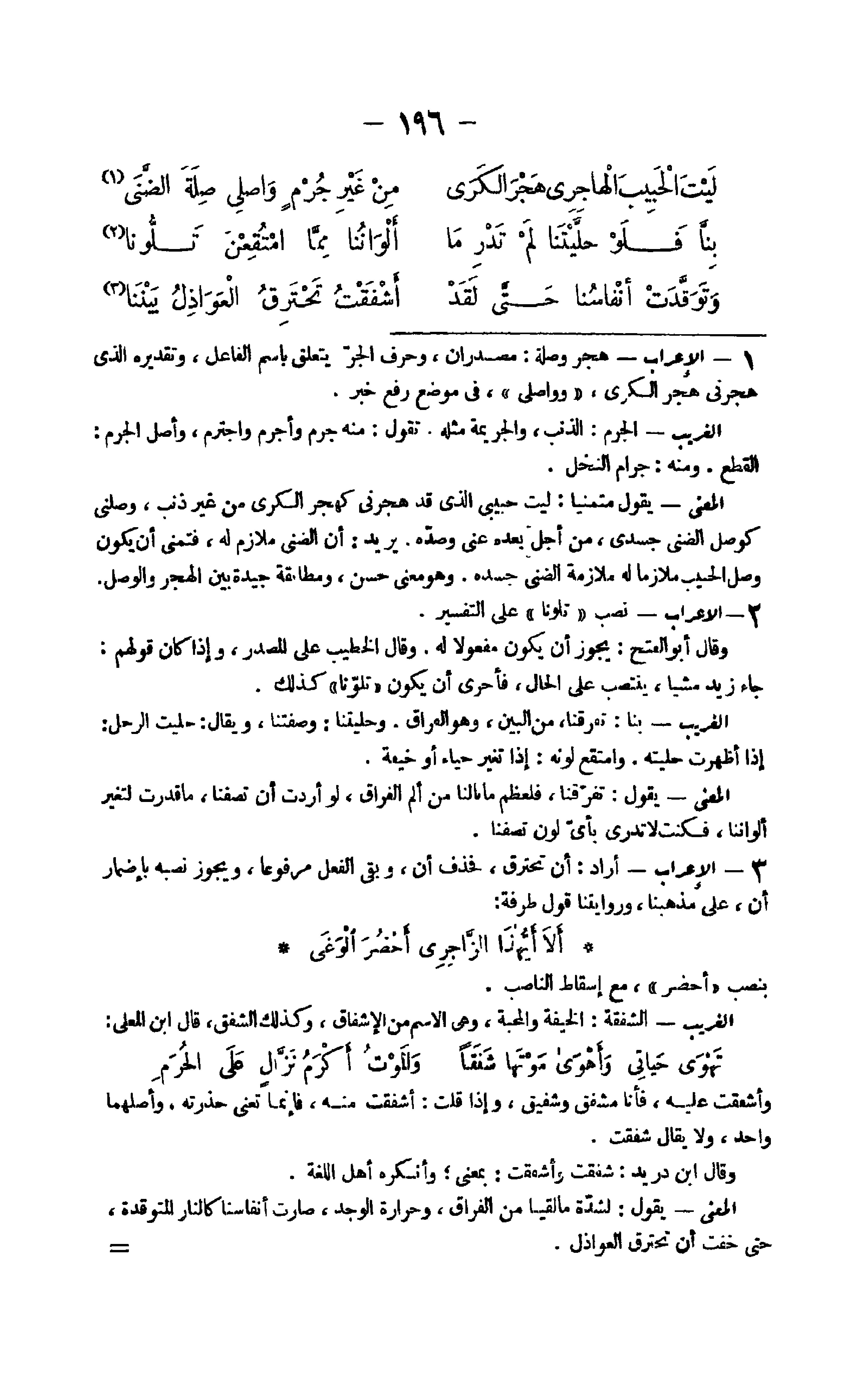 - الْإِعْرَاب هجر وصلَة مصدران وحرف الْجَرّ يتَعَلَّق باسم الْفَاعِل وَتَقْدِيره الَّذِي هجرني هجر الْكرَى وواصلي فِي مَوضِع رفع خبر الْغَرِيب الجرم الذَّنب والجريمة مثله تَقول مِنْهُ جرم وأجرم واجترم وأصل الجرم الْقطع وَمِنْه جرام النّخل الْمَعْنى يَقُول متمنيا لَيْت حَبِيبِي الَّذِي قد هجرني كهجر الْكرَى من غير ذَنْب وصلني كوصل الضنى جَسَدِي من أجل بعده عَن وصده يُرِيد أَن الضنى ملازم لَهُ فتمنى أَن يكون وصل الحبيب ملازما لَهُ مُلَازمَة الضنى جسده وَهُوَ معنى حسن ومطابقة جَيِّدَة بَين الهجر والوصل