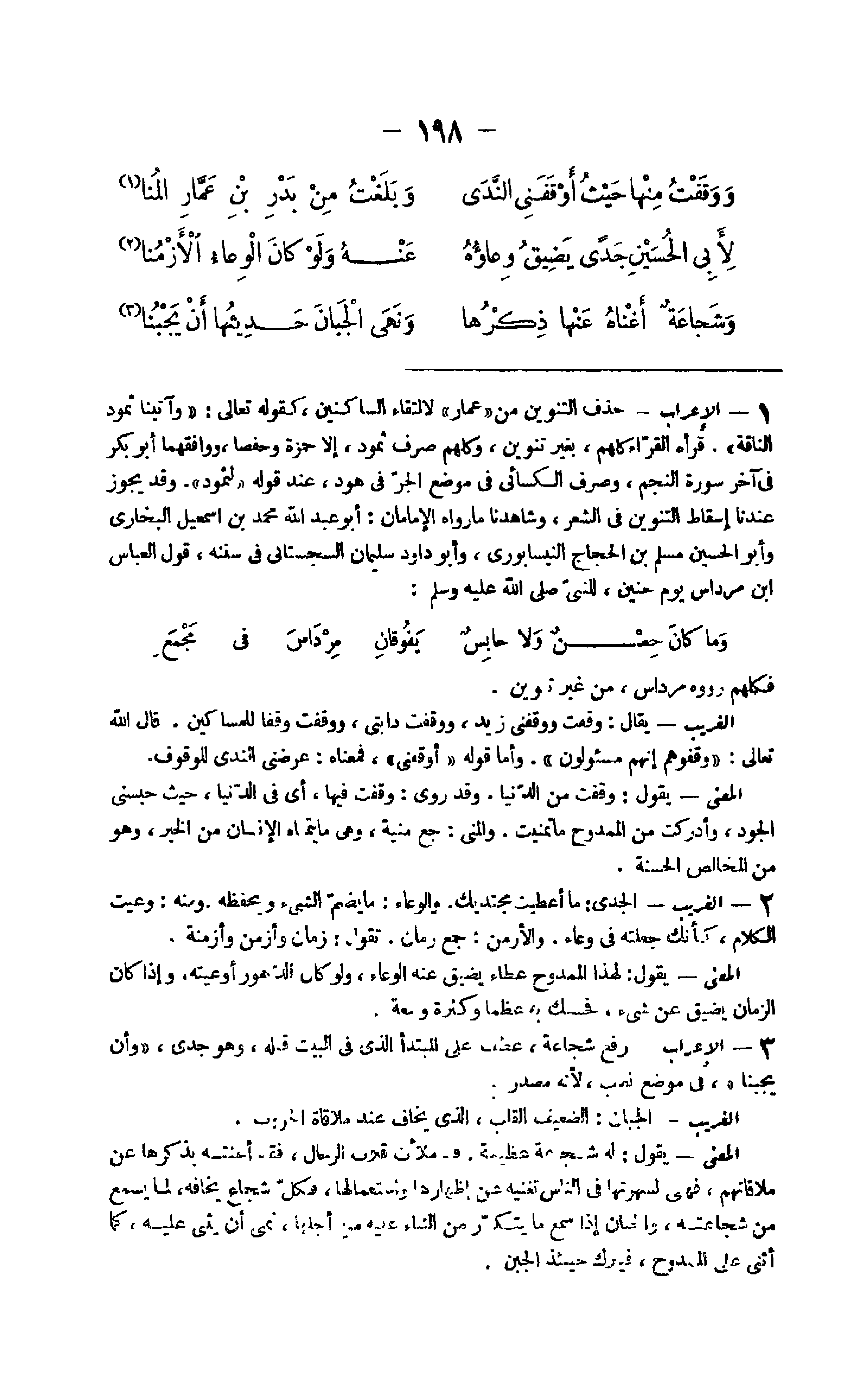 - الْإِعْرَاب حذف التَّنْوِين من عمار لالتقاء الساكنين كَقَوْلِه تَعَالَى {وآتينا ثَمُود النَّاقة} قَرَأَهُ الْقُرَّاء كلهم بِغَيْر تَنْوِين وَكلهمْ صرف ثَمُود إِلَّا حَمْزَة وحفصا وَوَافَقَهُمَا أَبُو بكر فِي آخر سُورَة النَّجْم وَصرف الْكسَائي فِي مَوضِع الْجَرّ فِي هود عِنْد قَوْله لثمود وَقد يجوز عندنَا إِسْقَاط التَّنْوِين فِي الشّعْر وشاهدنا مَا رَوَاهُ الإمامان أَبُو عبد الله مُحَمَّد بن إِسْمَاعِيل البُخَارِيّ وَأَبُو الْحُسَيْن مُسلم بن الْحجَّاج النَّيْسَابُورِي وَأَبُو دَاوُد سُلَيْمَان السجيتاني فِي سنَنه قَول الْعَبَّاس بن مرداس يَوْم حنين للنَّبِي