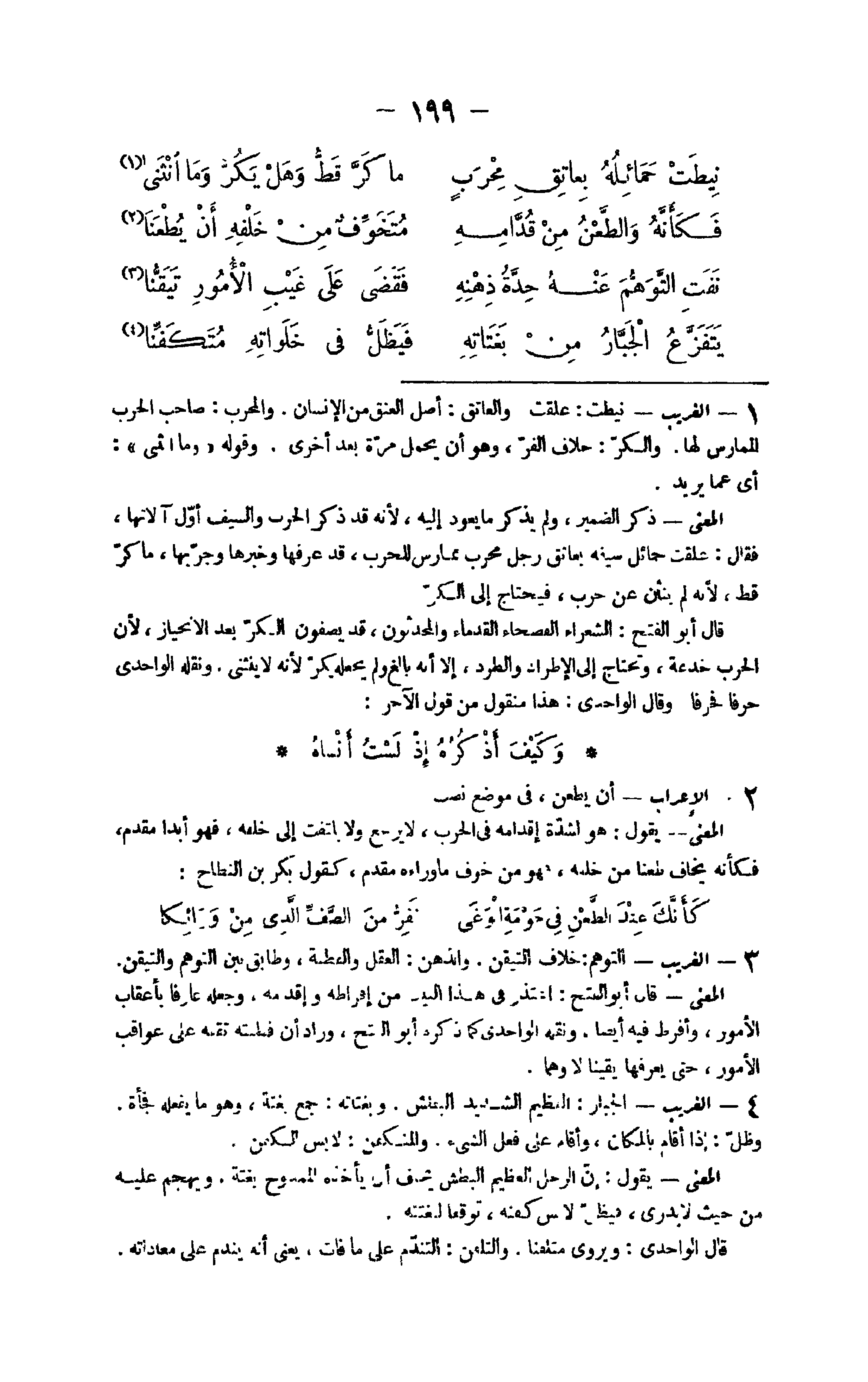 - الْغَرِيب نيطت علقت والعانق أصل الْعُنُق من الْإِنْسَان ووالمحرب صَاحب الْحَرْب الممارس لَهَا وَالْكر خلاف الغر وَهُوَ أَن يحمل مرّة بعد أُخْرَى وَقَوله وَمَا أنثنى أَي عَمَّا يُرِيد الْمَعْنى ذكر الضَّمِير وَلم يذكر مَا يعود إِلَيْهِ لِأَنَّهُ قد ذكر الْحَرْب وَالسيف أول آلانها فَقَالَ علقت حمائل سَيْفه بعانق رجل محرب ممارس للحرب قد عرفهَا وخبرها وجر بهَا مَا كرّ قطّ لِأَنَّهُ لم ينثن عَن حَرْب فَيحْتَاج إِلَى الْكر قَالَ أَبُو الْفَتْح الشُّعَرَاء الفصحاء القدماء والمحدثون قد يصفونَ الْكر بعد الانحياز لِأَن الْحَرْب خدعة وتحتاج إِلَى الإطراد والطرد إِلَّا أَنه بَالغ وَلم يَجعله يكر لِأَنَّهُ لَا ينثني وَنَقله الواحدي حرفا فحرفا وَقَالَ الواحدي هَذَا مَنْقُول من قَول الآخر