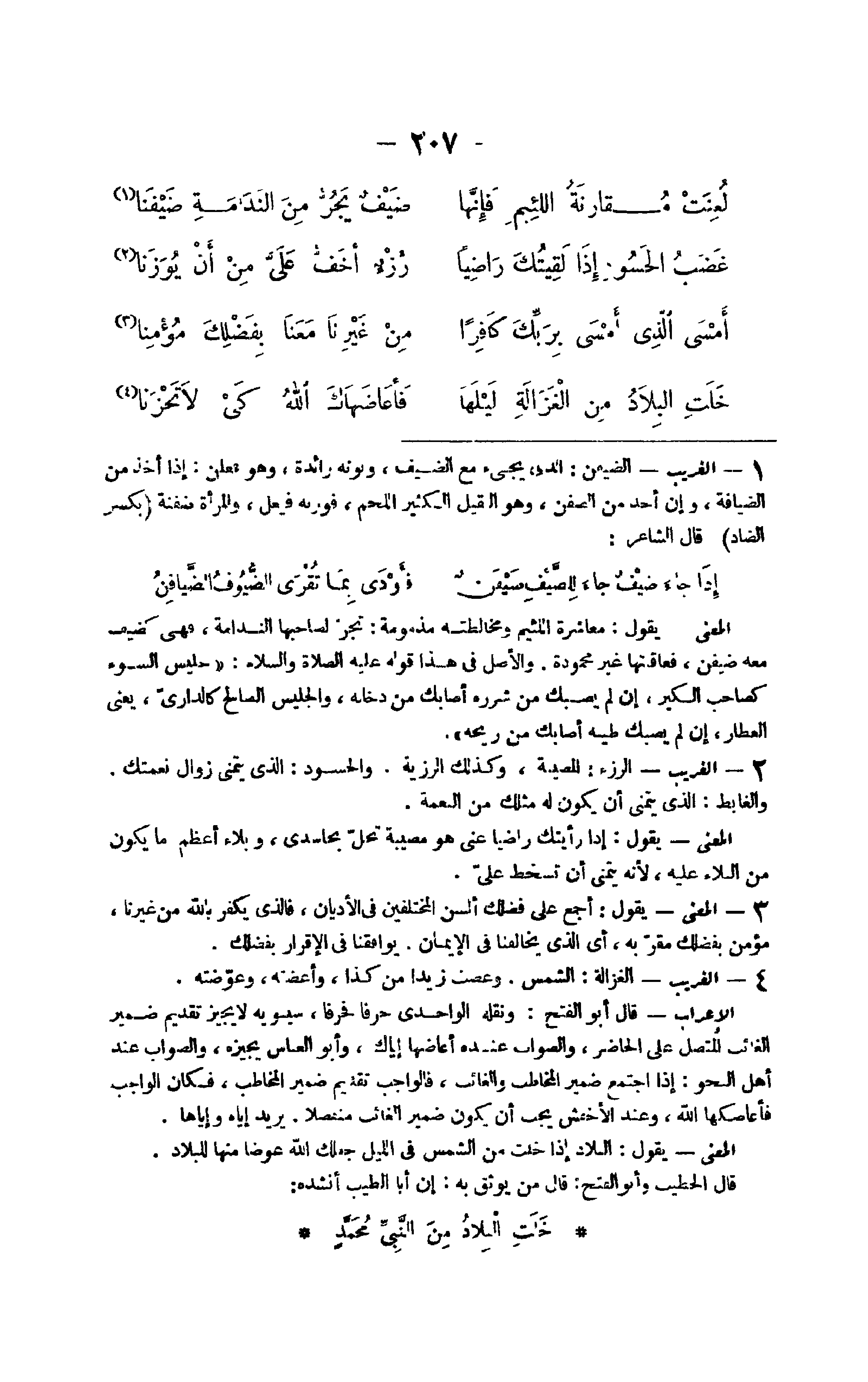 41 - الْغَرِيب الغزالة الشَّمْس وعضت زيدا من كَذَا وأعضته وعوضته الْإِعْرَاب قَالَ أَبُو الْفَتْح وَنَقله الواحدي حرفا فحرفا سِيبَوَيْهٍ لَا يُجِيز تَقْدِيم ضمير الْغَائِب الْمُتَّصِل على الْحَاضِر وَالصَّوَاب عِنْده أعاضها إياك وَأَبُو الْعَبَّاس يُجِيزهُ وَالصَّوَاب عِنْد أهل النَّحْو إِذا اجْتمع ضمير الْمُخَاطب وَالْغَائِب فَالْوَاجِب تَقْدِيم ضمير الْمُخَاطب فَكَانَ الْوَاجِب فأعاضكها الله وَعند الْأَخْفَش يجب أَن يكون ضمير الْغَائِب مُنْفَصِلا يُرِيد إِيَّاه وَإِيَّاهَا الْمَعْنى يَقُول الْبِلَاد إِذا خلت من الشَّمْس فِي اللَّيْل جعلك الله عوضا مِنْهَا للبلاد قَالَ الْخَطِيب وَأَبُو الْفَتْح قَالَ من يوثق بِهِ إِن أَبَا الطّيب أنْشدهُ