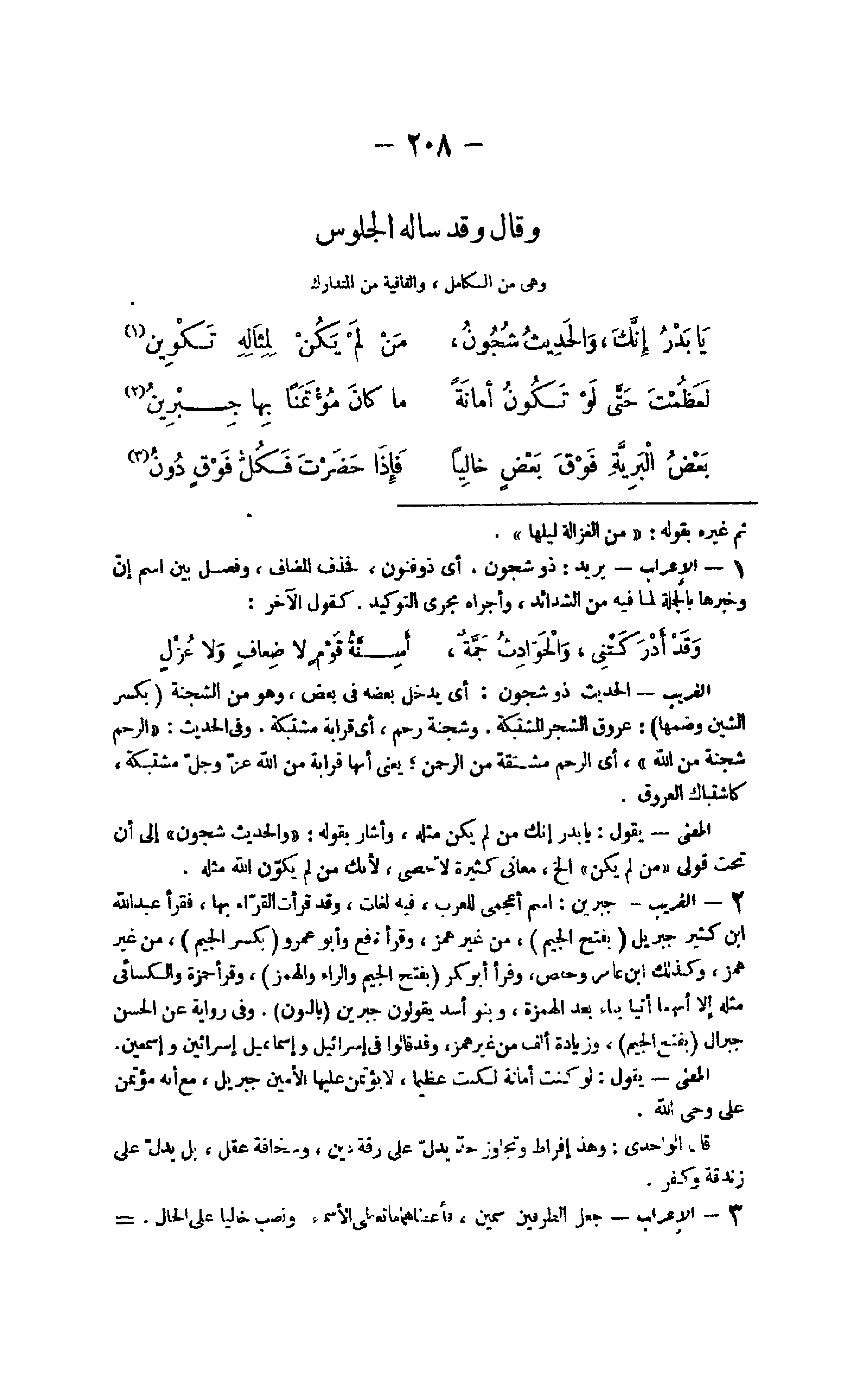 الْغَرِيب الحَدِيث ذُو شجون أَي يدْخل بعضه فِي بعض وَهُوَ من الشجنة بِكَسْر الشين وَضمّهَا عروق الشّجر المشتبكة وشجنة رحم أَي قرَابَة مشتبكة وَفِي الحَدِيث الرَّحِم شجنة من الله أَي الرَّحِم مُشْتَقَّة من الرَّحْمَن يَعْنِي أَنَّهَا قرَابَة من الله عز وَجل مشتبكة كاشتباك الْعُرُوق الْمَعْنى يَقُول يَا بدر إِنَّك من لم يكن مثله وَأَشَارَ بقوله والْحَدِيث شجون إِلَى أَن تَحت قولي من لم يكن الخ مَعَاني كَثِيرَة لَا تحصى لِأَنَّك من لم يكون الله مثله