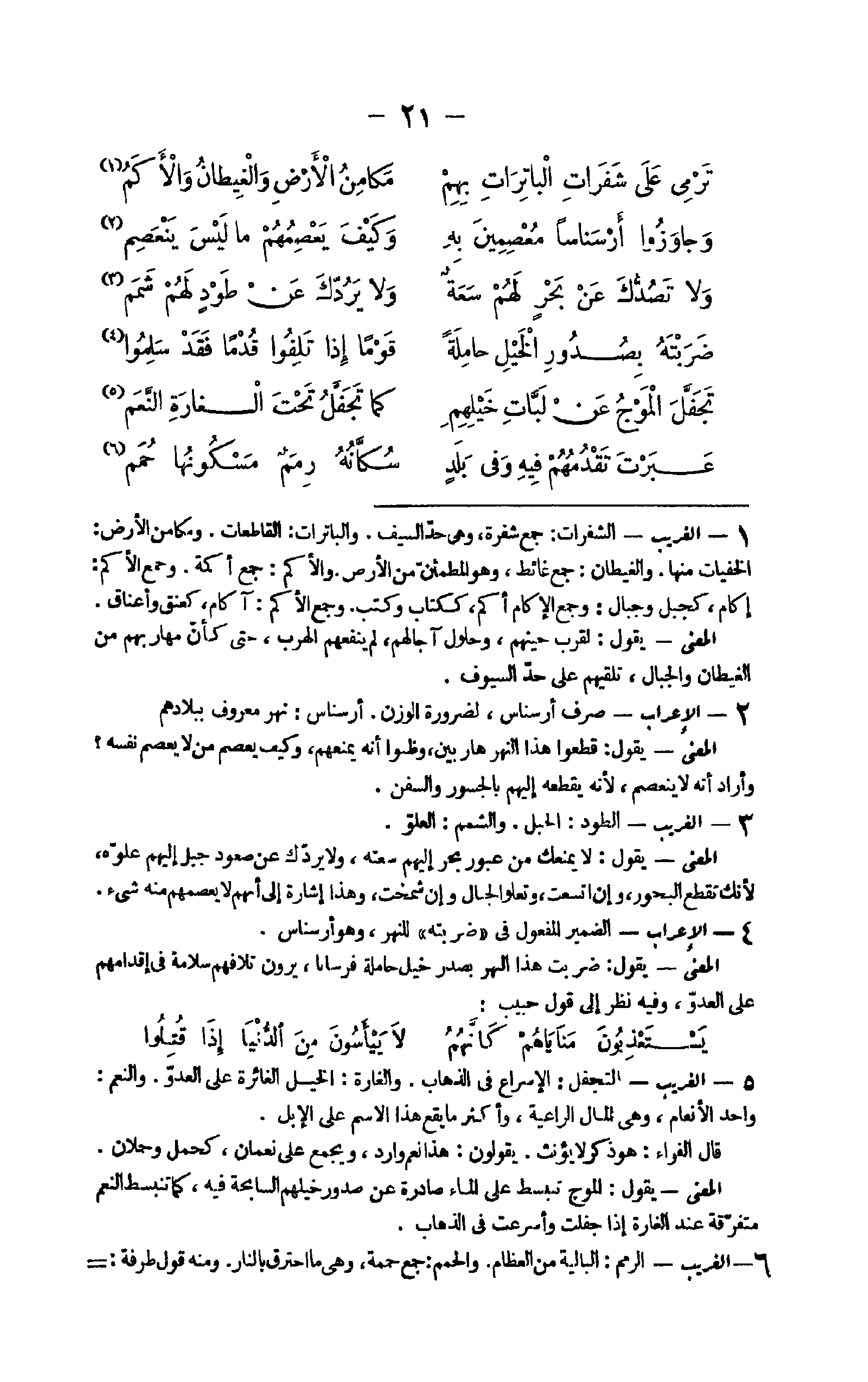 - الْغَرِيب الشفرات جمع شفرة وَهِي حد السَّيْف والباترات القاطعات ومكامن الأَرْض الخفيات مِنْهَا والغيطان جمع غَائِط وَهُوَ المطمئن من الأَرْض والأكم جمع أكمة وَجمع الأكم إكام كجبل وجبال وَجمع الإكام أكم ككتاب وَكتب وَجمع الأكم آكام كعنق وأعناق الْمَعْنى يَقُول لقرب حينهم وحلول آجالهم لم يَنْفَعهُمْ الْهَرَب حَتَّى كَأَن مهاربهم من الْغِيطَان وَالْجِبَال تلقيهم على حد السيوف