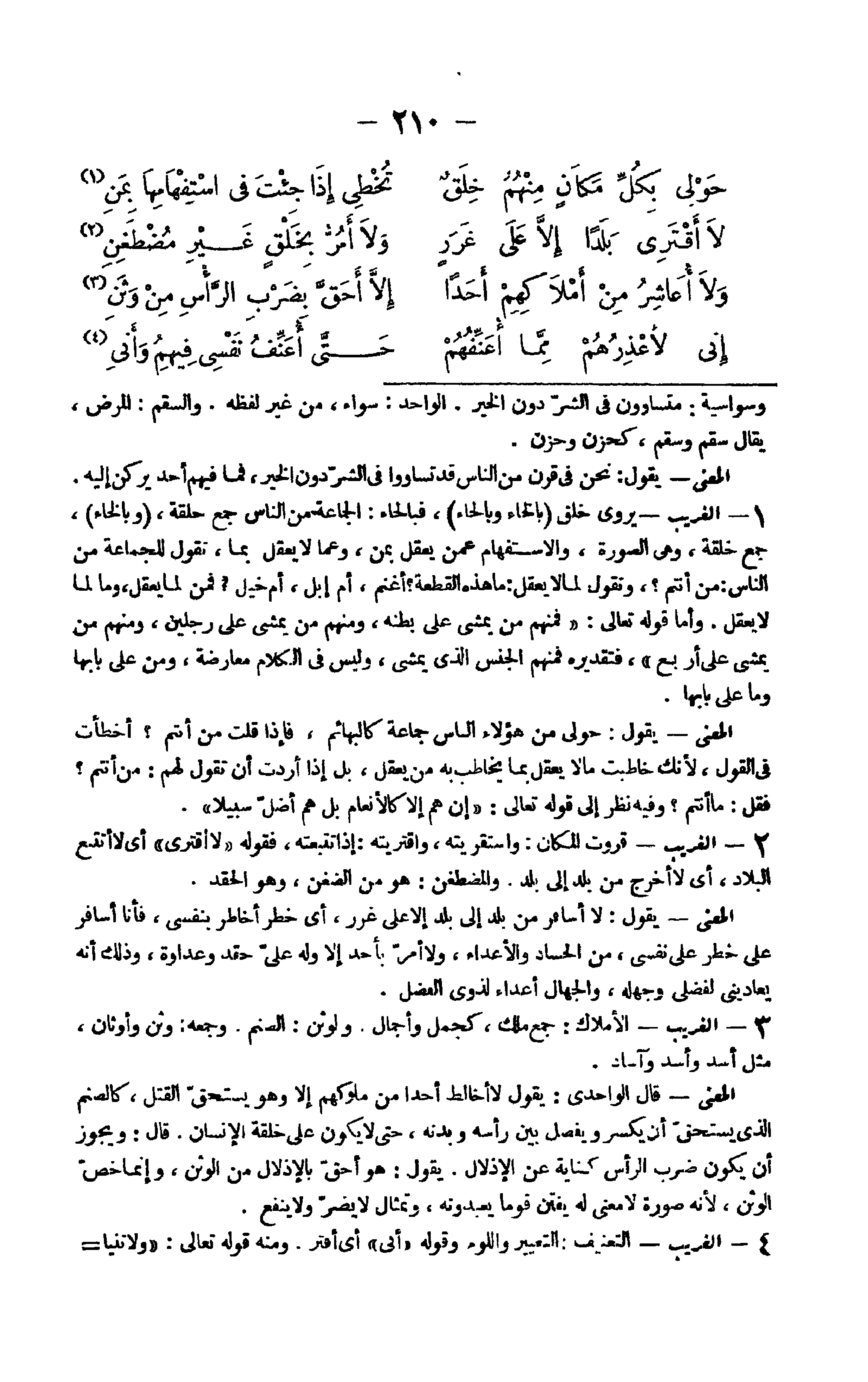 4 - الْغَرِيب قروت الْمَكَان واستقريته واقتريته إِذا تتبعته فَقَوله لَا أفتري أَي لَا أتتبع الْبِلَاد أَي لَا أخرج من بلد إِلَى بلد والمضطغن هُوَ من الضغن وهوا لحقد الْمَعْنى يَقُول لَا أسافر من بلد إِلَى بلد إِلَّا على غرر أَي خطر أخاطر بنفسي فَأَنا أسافر على خطر على نَفسِي من الحساد والأعداء وَلَا أَمر بِأحد إِلَّا وَله عَليّ حقد وعداوة وَذَلِكَ أَنه يعاديني لفضلي وجهله والجهال أَعدَاء لِذَوي الْفضل