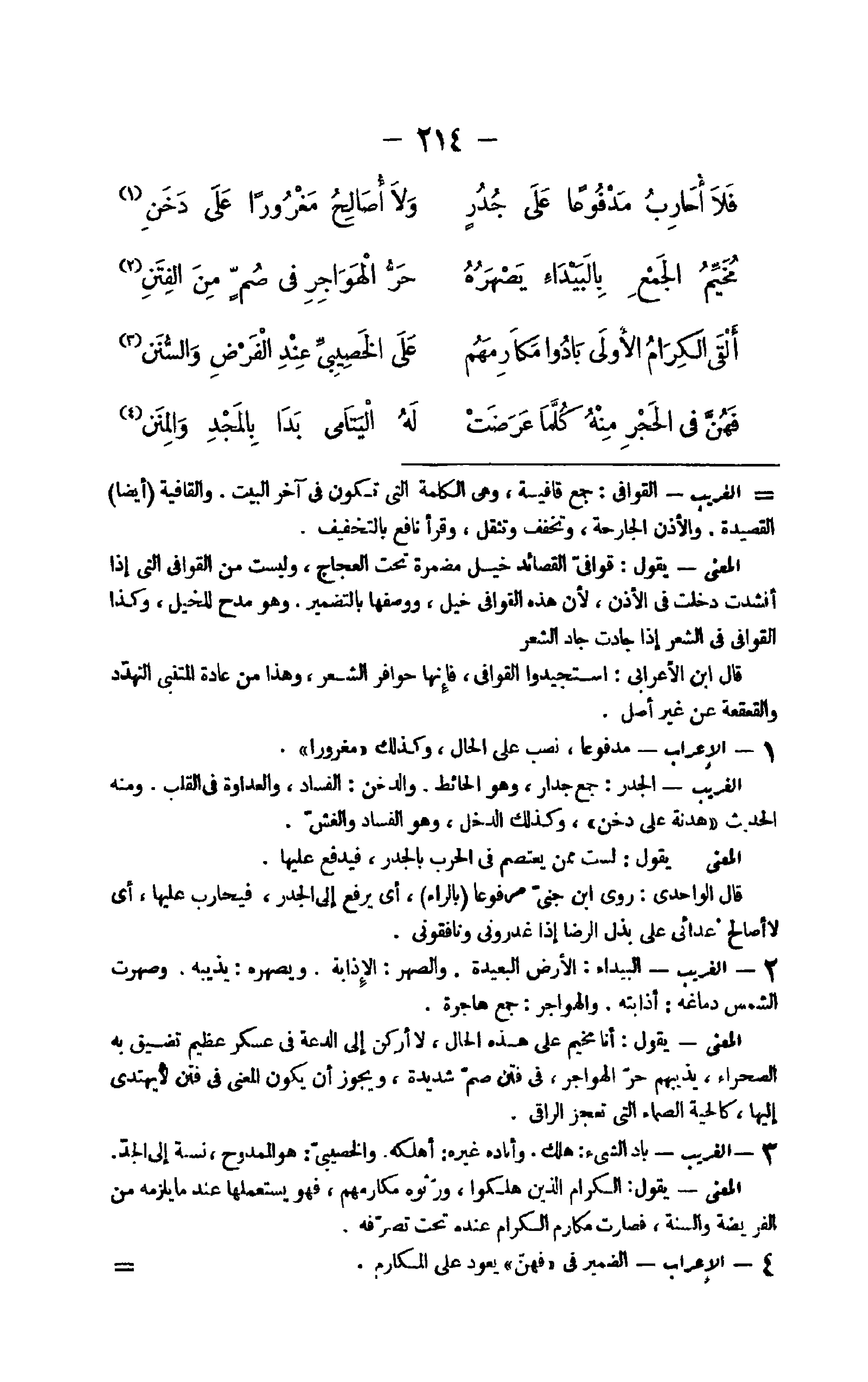 20 - الْغَرِيب الْبَيْدَاء الأَرْض الْبَعِيدَة والصهر الإذابة ويصهره يذيبه وصهرت الشَّمْس دماغه أذابته والهواجر جمع هاجرة الْمَعْنى يَقُول أَنا مخيم على هَذِه الْحَال لَا أركن إِلَى الدعة فِي عَسْكَر عَظِيم تضيق بِهِ الصَّحرَاء يذيبهم حر الهواجر فِي فتن صم شَدِيدَة وَيجوز أَن يكون الْمَعْنى فِي فتن لَا يَهْتَدِي إِلَيْهَا كالحية الصماء الَّتِي تعجز الراقي