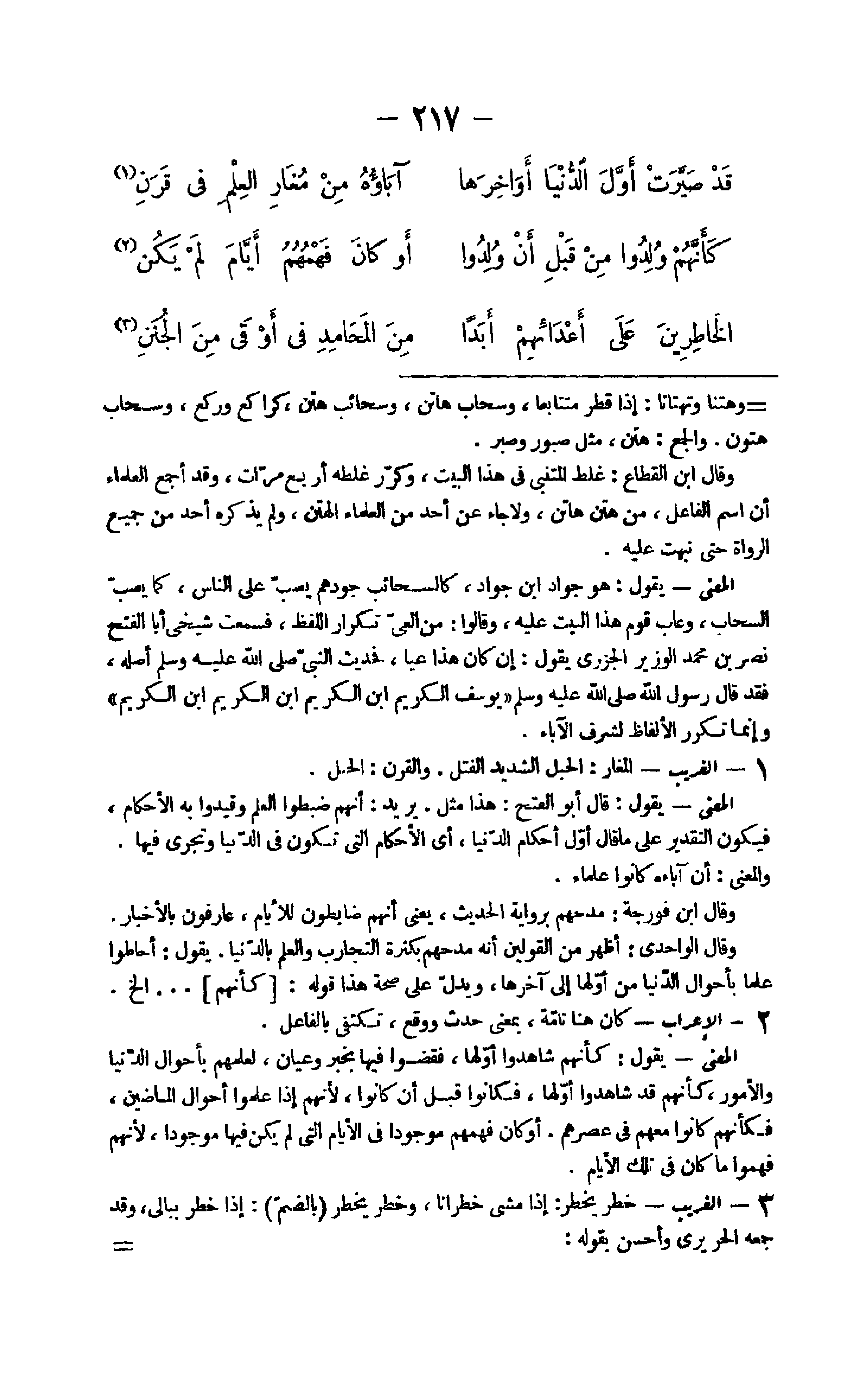 30 - الْغَرِيب المغار الْحَبل الشَّديد الفتل والقرن الْحَبل الْمَعْنى يَقُول قَالَ أَبُو الْفَتْح هَذَا مثل يُرِيد أَنهم ضبطوا الْعلم وقيدوا بِهِ الْأَحْكَام فَيكون التَّقْدِير على مَا قَالَ أول أَحْكَام الدُّنْيَا أَي الْأَحْكَام الَّتِي تكون فِي الدُّنْيَا وتجري فِيهَا وَالْمعْنَى أَن آباءه كَانُوا عُلَمَاء وَقَالَ ابْن فورجة مدحهم بِرِوَايَة الحَدِيث يَعْنِي أَنهم ضابطون للأيام عارفون بالأخبار وَقَالَ الواحدي أظهر من الْقَوْلَيْنِ أَنه مدحهم بِكَثْرَة التجارب وَالْعلم بالدنيا يَقُول أحاطوا علما بأحوال الدُّنْيَا من أَولهَا إِلَى آخرهَا وَيدل على صِحَة هَذَا قَوْله كَأَنَّهُمْ الخ