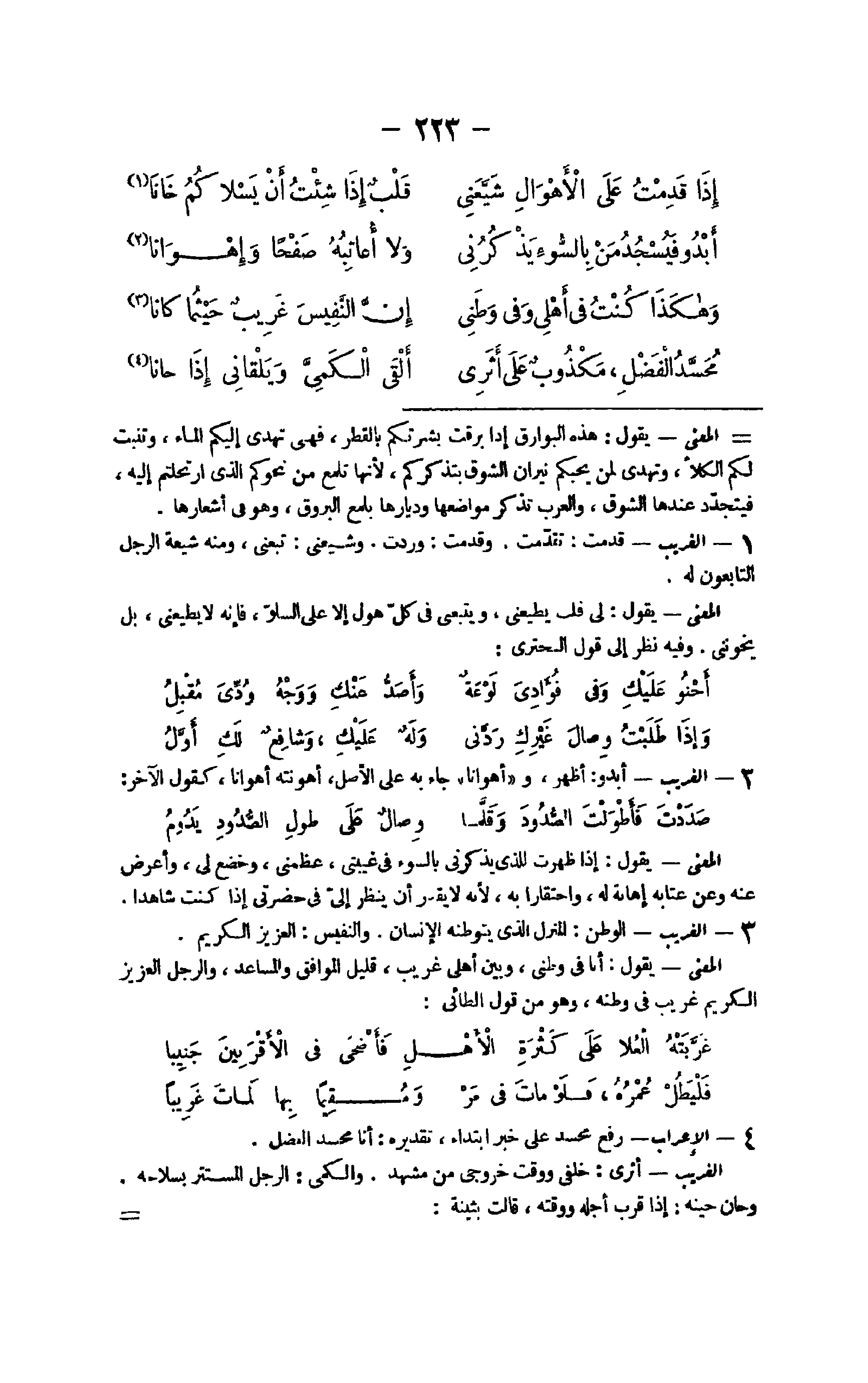 11 - الْغَرِيب الوطن الْمنزل الَّذِي يتوطنه الْإِنْسَان والنفيس الْعَزِيز الْكَرِيم الْمَعْنى يَقُول أَنا فِي وطني وَبَين أَهلِي غَرِيب قَلِيل الْمُوَافق والمساعد وَالرجل الْعَزِيز الْكَرِيم غَرِيب فِي وَطنه وَهُوَ من قَول الطَّائِي