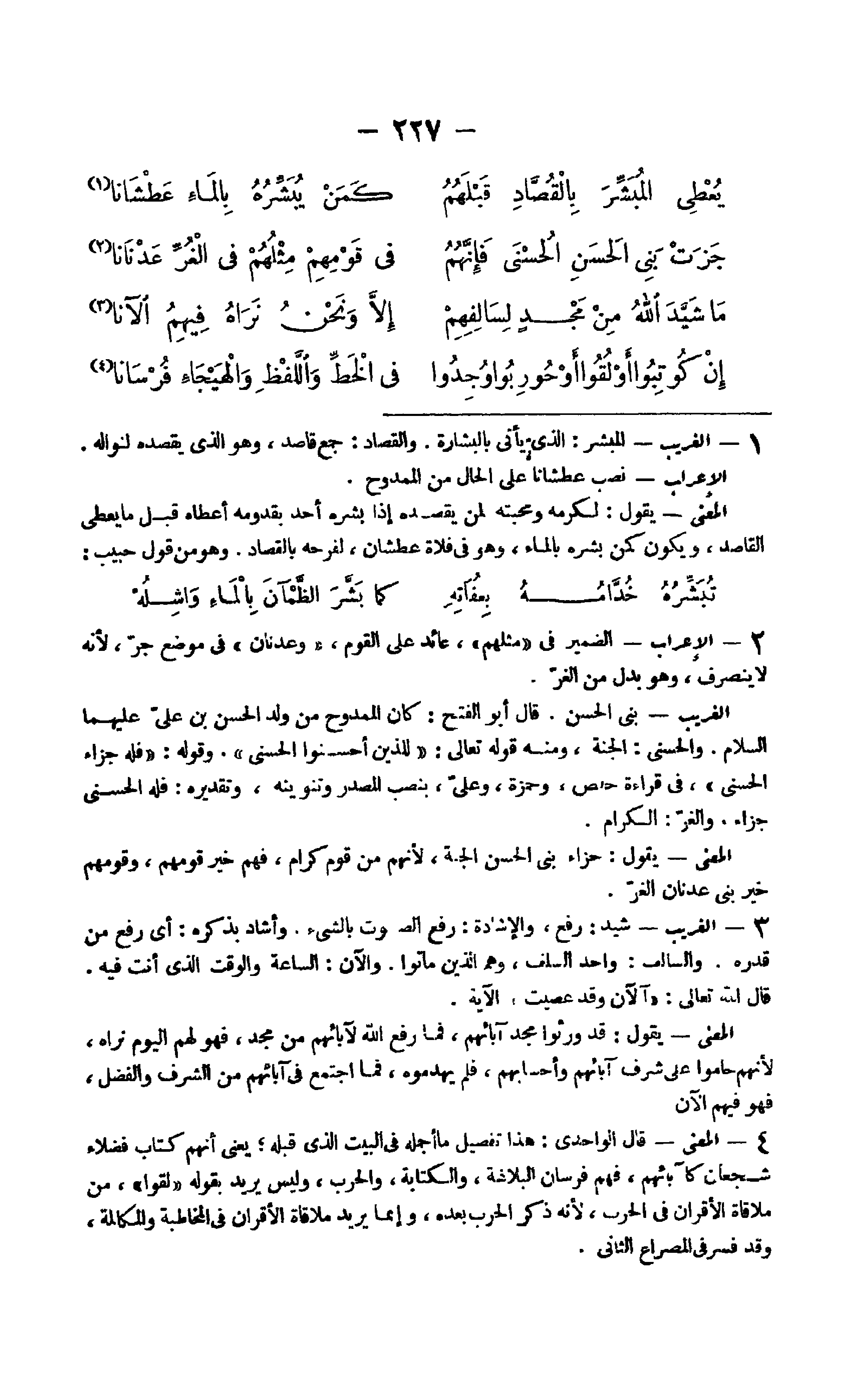25 - الْإِعْرَاب الضَّمِير فِي مثلهم عَائِد على الْقَوْم وعدنان فِي مَوضِع جر لِأَنَّهُ لَا ينْصَرف وَهُوَ بدل من الغر الْغَرِيب بني الْحسن قَالَ أَبُو الْفَتْح كَانَ الممدوح من ولد الْحسن بن عَليّ عَلَيْهِمَا السَّلَام وَالْحُسْنَى الْجنَّة وَمِنْه قَوْله تَعَالَى {للَّذين أَحْسنُوا الْحسنى} وَقَوله {فَلهُ جَزَاء الْحسنى} فِي قِرَاءَة حَفْص وَحَمْزَة وَعلي بِنصب الْمصدر وتنوينه وَتَقْدِيره فَلهُ الْحسنى جَزَاء والغر الْكِرَام الْمَعْنى يَقُول جَزَاء بني الْحسن الْجنَّة لأَنهم من قوم كرام فهم خير قَومهمْ وقرمهم خير بني عدنان الغر