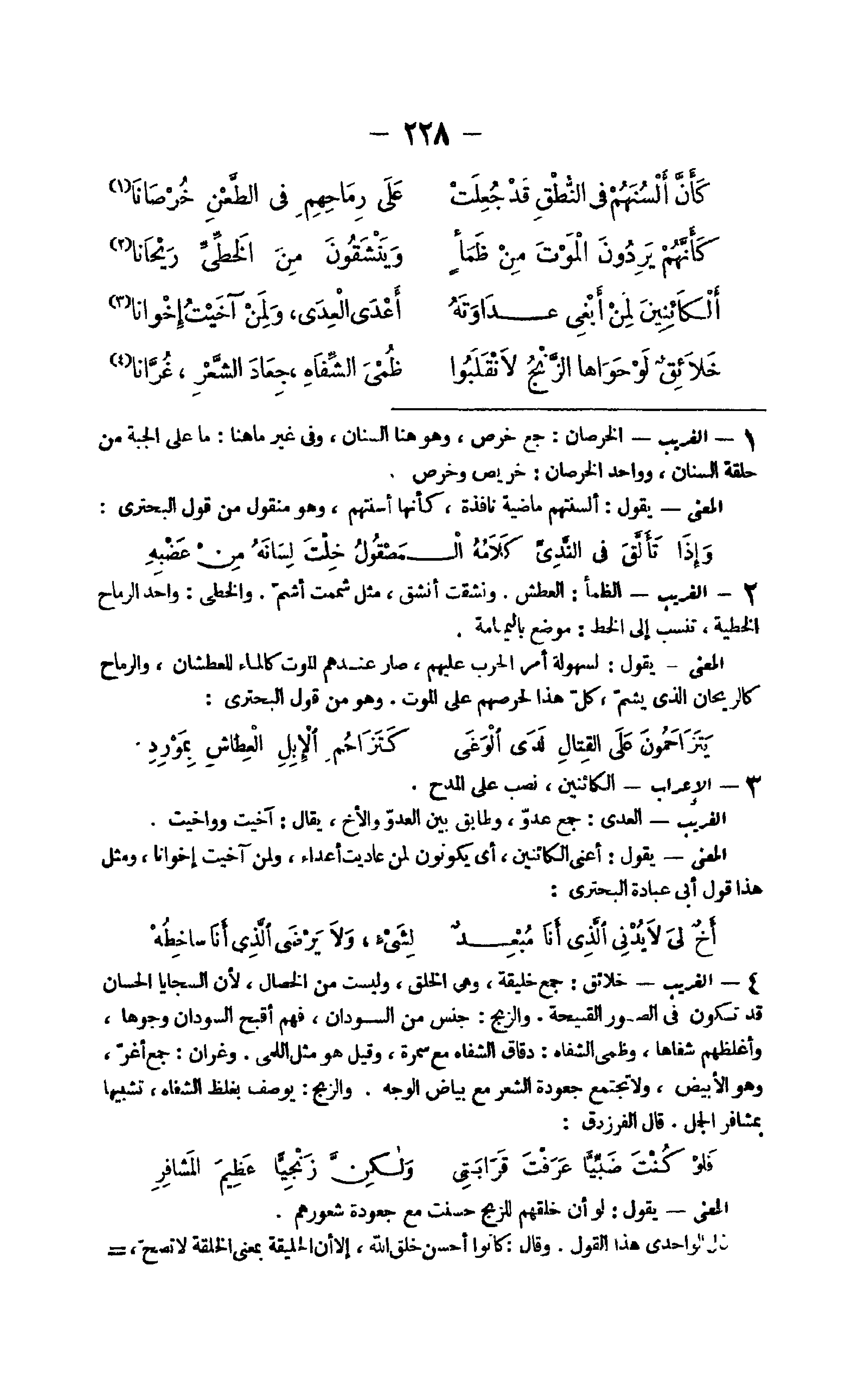 - الْغَرِيب الخرصان جمع خرص وَهُوَ هُنَا السنان وَفِي غير مَا هُنَا مَا على الْجُبَّة من حَلقَة السنان وَوَاحِد الخرصان خريص وخرص الْمَعْنى يَقُول ألسنتهم مَاضِيَة نَافِذَة كَأَنَّهَا أسنتهم وَهُوَ مَنْقُول من قَول البحتري