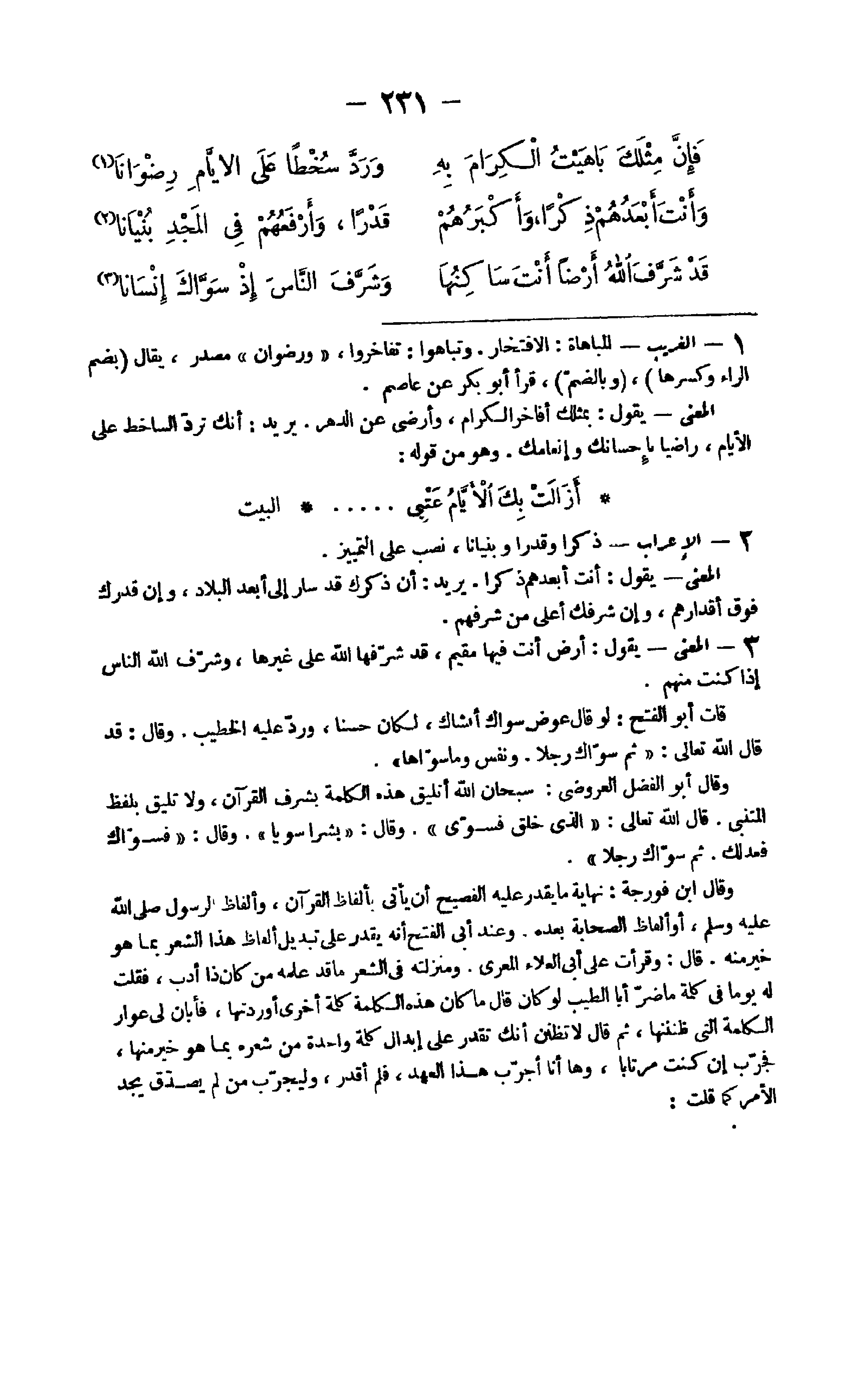- الْغَرِيب المباهاة الافتخار وتباهوا تفاخروا ورضوان مصدر يُقَال بِضَم الرَّاء وَكسرهَا وبالضم قَرَأَ أَبُو بكر عَن عَاصِم الْمَعْنى يَقُول بمثلك أفاخر الْكِرَام وأرضى عَن الدَّهْر يُرِيد أَنَّك ترد الساخط على الْأَيَّام رَاضِيا بإحسانك وإنعامك وَهُوَ من قَوْله