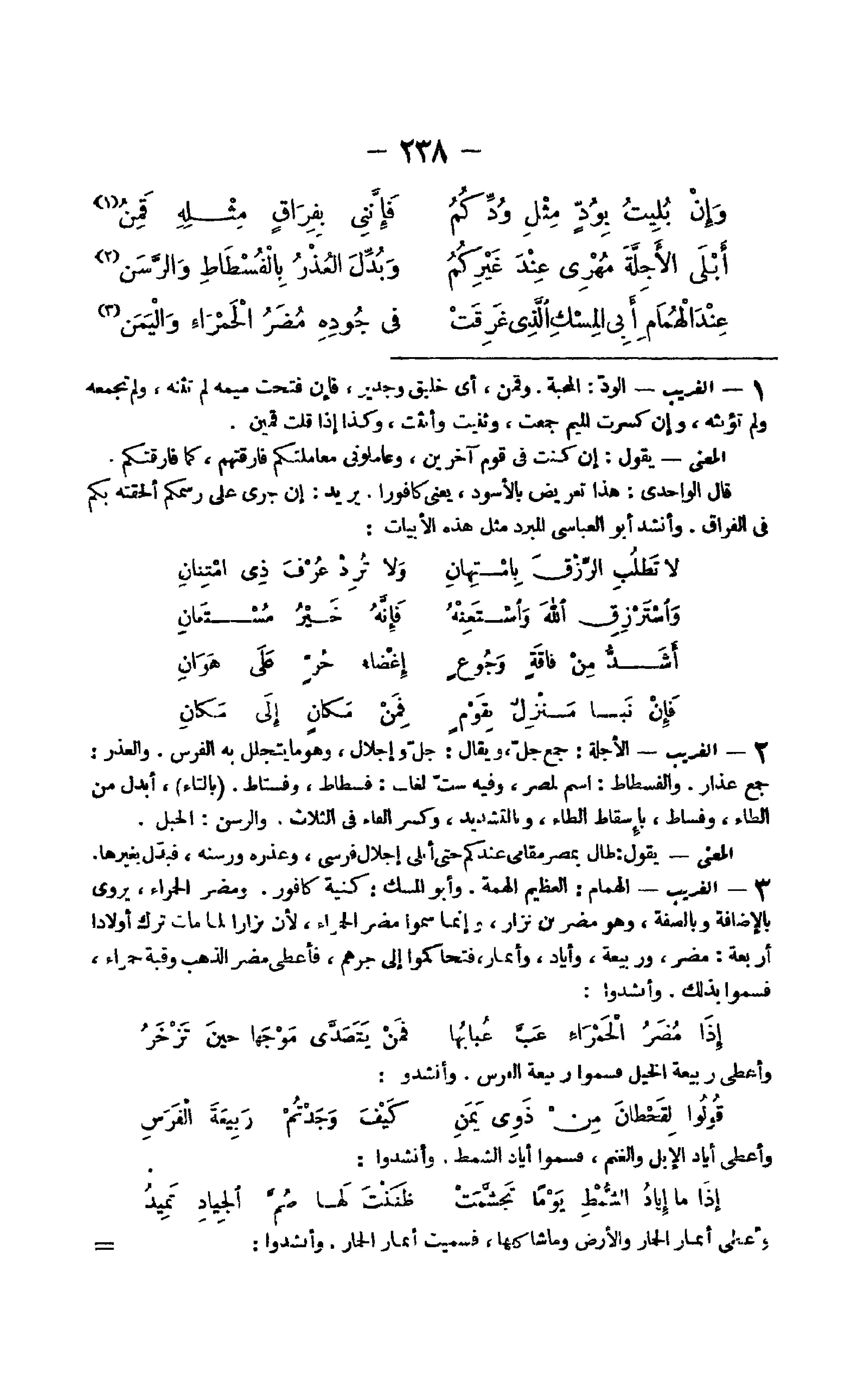 23 - الْغَرِيب الْهمام الْعَظِيم الهمة وَأَبُو الْمسك كنية كافور وَمُضر الْحَمْرَاء يرْوى بِالْإِضَافَة وبالصفة وَهُوَ مُضر بن نزار وَإِنَّمَا سموا مُضر الْحَمْرَاء لِأَن نزاراً لما مَاتَ ترك أَوْلَادًا أَرْبَعَة مُضر وَرَبِيعَة وإياد وأنمار فتحا كموا إِلَى جرهم فَأعْطى مُضر الذَّهَب وقبة حَمْرَاء فسموا بذلك وأنشدوا