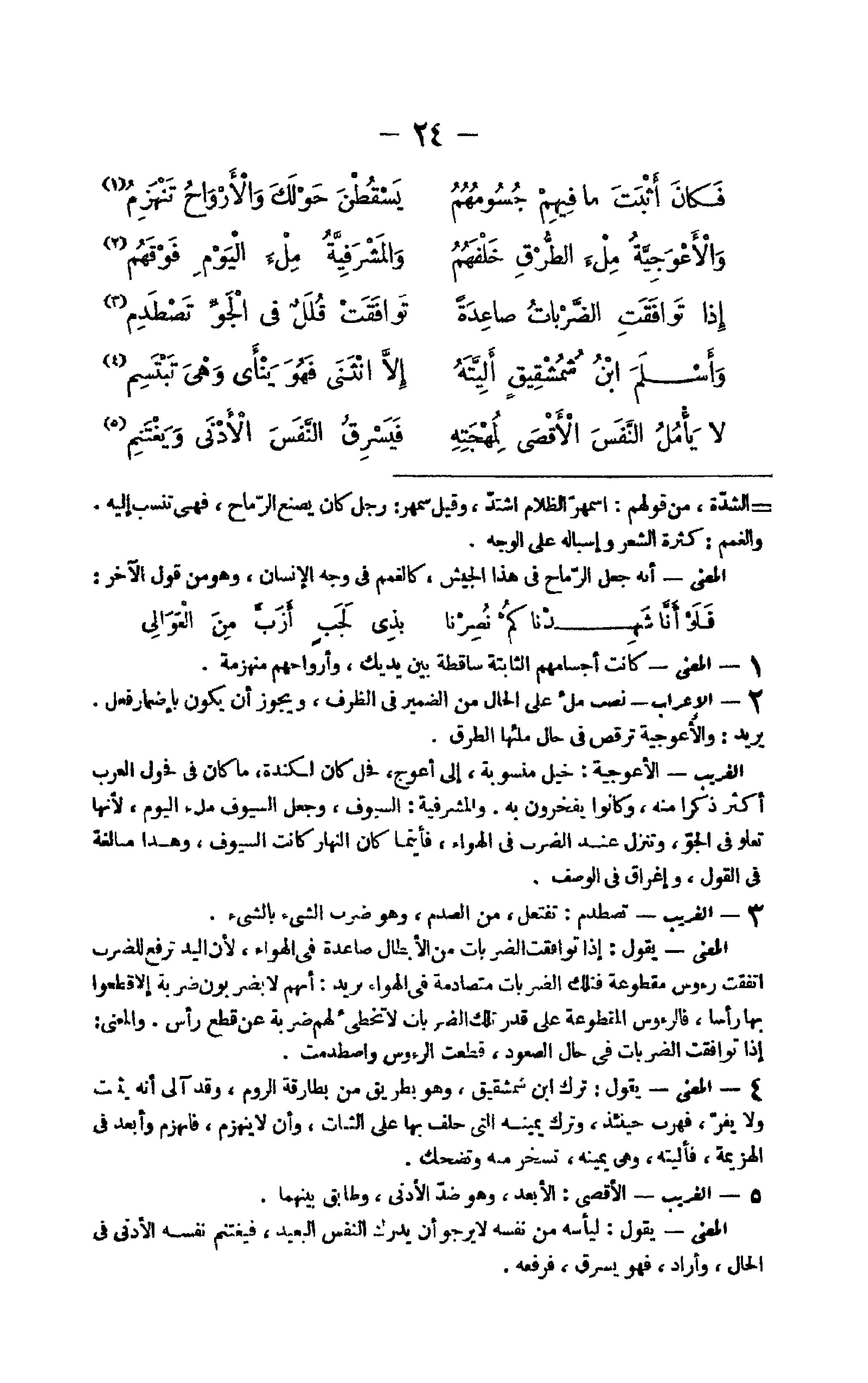 41 - الْغَرِيب تصطدم تفتعل من الصدم وَهُوَ ضرب الشَّيْء بالشَّيْء الْمَعْنى يَقُول إِذا توافقت الضربات من الْأَبْطَال صاعدة فِي الْهَوَاء لِأَن الْيَد ترفع المضرب اتّفقت رُءُوس مَقْطُوعَة فَتلك الضربات متصادمة فِي الْهَوَاء يُرِيد أَنهم لَا يضْربُونَ ضَرْبَة إِلَّا قطعُوا بهَا رَأْسا فالرءوس المقطوعة على قد تِلْكَ الضربات لَا تخطئ لَهُم ضَرْبَة عَن قطع رَأس وَالْمعْنَى إِذا توافقت الضربات فِي حَال الصعُود قطعت الرُّءُوس واصطدمت