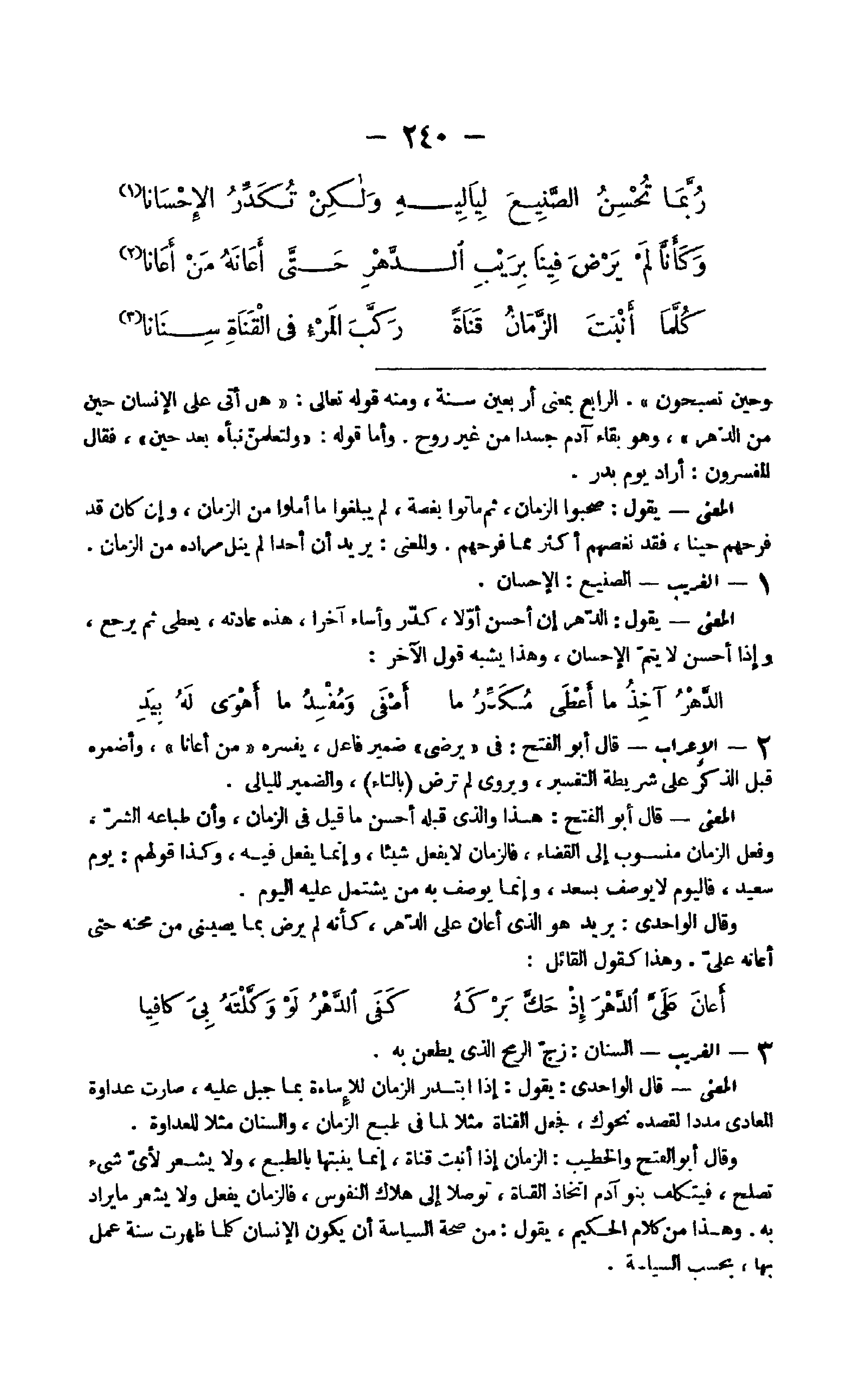 3 - الْغَرِيب الصَّنِيع الْإِحْسَان الْمَعْنى يَقُول الدَّهْر إِن أحسن أَولا كدر وأساء آخرا هَذِه عَادَته يعْطى ثمَّ يرجع وَإِذا أحسن لَا يتم الْإِحْسَان وَهَذَا يشبه قَول الآخر