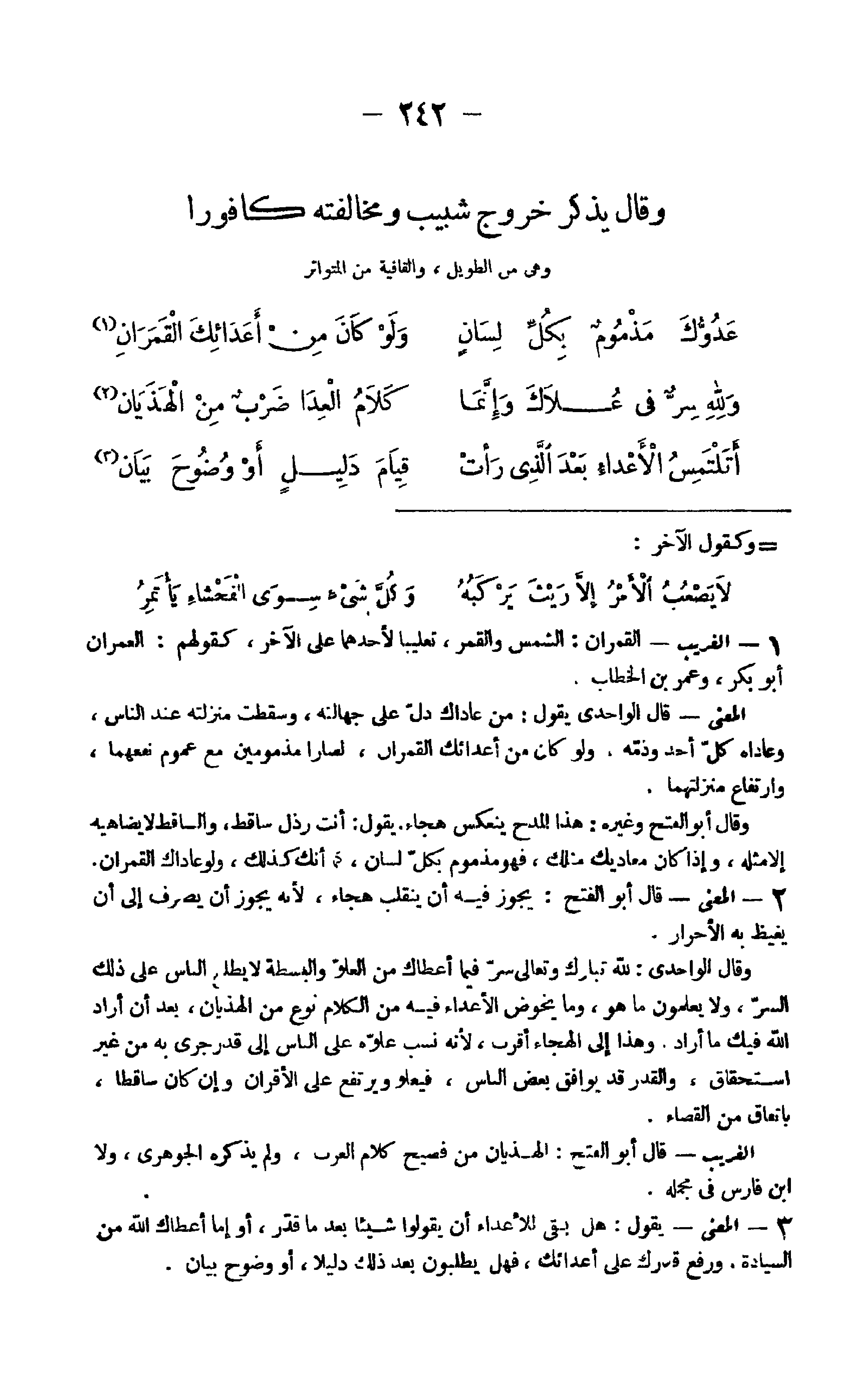 - 1 الْغَرِيب القمران الشَّمْس وَالْقَمَر تَغْلِيبًا لأَحَدهمَا على الآخر كَقَوْلِهِم الْعمرَان أَبُو بكر وَعمر بن الْخطاب الْمَعْنى قَالَ الواحدي يَقُول من عاداك دلّ على جهالته وَسَقَطت مَنْزِلَته عِنْد النَّاس وعاداه كل أحد وذمه وَلَو كَانَ من أعدائك القمران لصارا مذمومين مَعَ عُمُوم نفعهما وارتفاع منزلتهما وَقَالَ أَبُو الْفَتْح وَغَيره هَذَا الْمَدْح ينعكس هجاء يَقُول أَنْت رذل سَاقِط والساقط لَا يضاهيه إِلَّا مثله وَإِذا كَانَ معاديك مثلك فَهُوَ مَذْمُوم بِكُل لِسَان كَمَا أَنَّك كَذَلِك وَلَو عاداك القمران