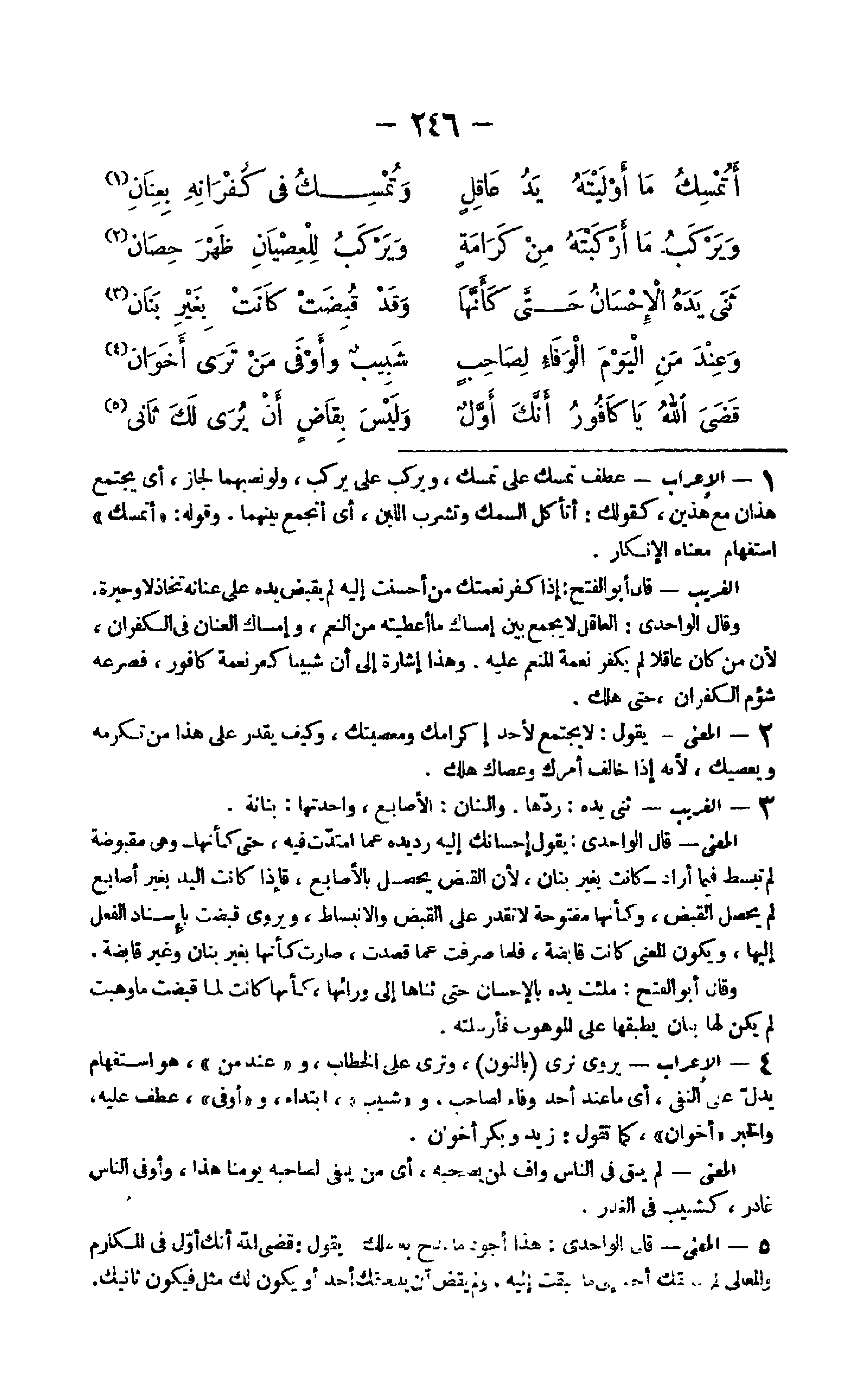 - الْإِعْرَاب عطف تمسك على تمسك ويركب على يركب وَلَو نصبهما لجَاز أَي يجْتَمع هَذَانِ مَعَ هذَيْن كَقَوْلِك أتأكل السّمك وتشرب اللَّبن أَي أتجمع بَينهمَا وَقَوله أتمسك اسْتِفْهَام مَعْنَاهُ الْإِنْكَار الْغَرِيب قَالَ أَبُو الْفَتْح إِذا كفر نِعْمَتك من أَحْسَنت إِلَيْهِ لم يقبض يَده على عنانه تخاذلا وحيرة وَقَالَ الواحدي الْعَاقِل لَا يجمع بَين إمْسَاك مَا أَعْطيته من النعم وإمساك الْعَنَان فِي الكفران لِأَن من كَانَ عَاقِلا لم يكفر نعْمَة الْمُنعم عَلَيْهِ وَهَذَا إِشَارَة إِلَى أَن شبيبا كفر نعْمَة كافور فصرعه شُؤْم الكفران حَتَّى هلك