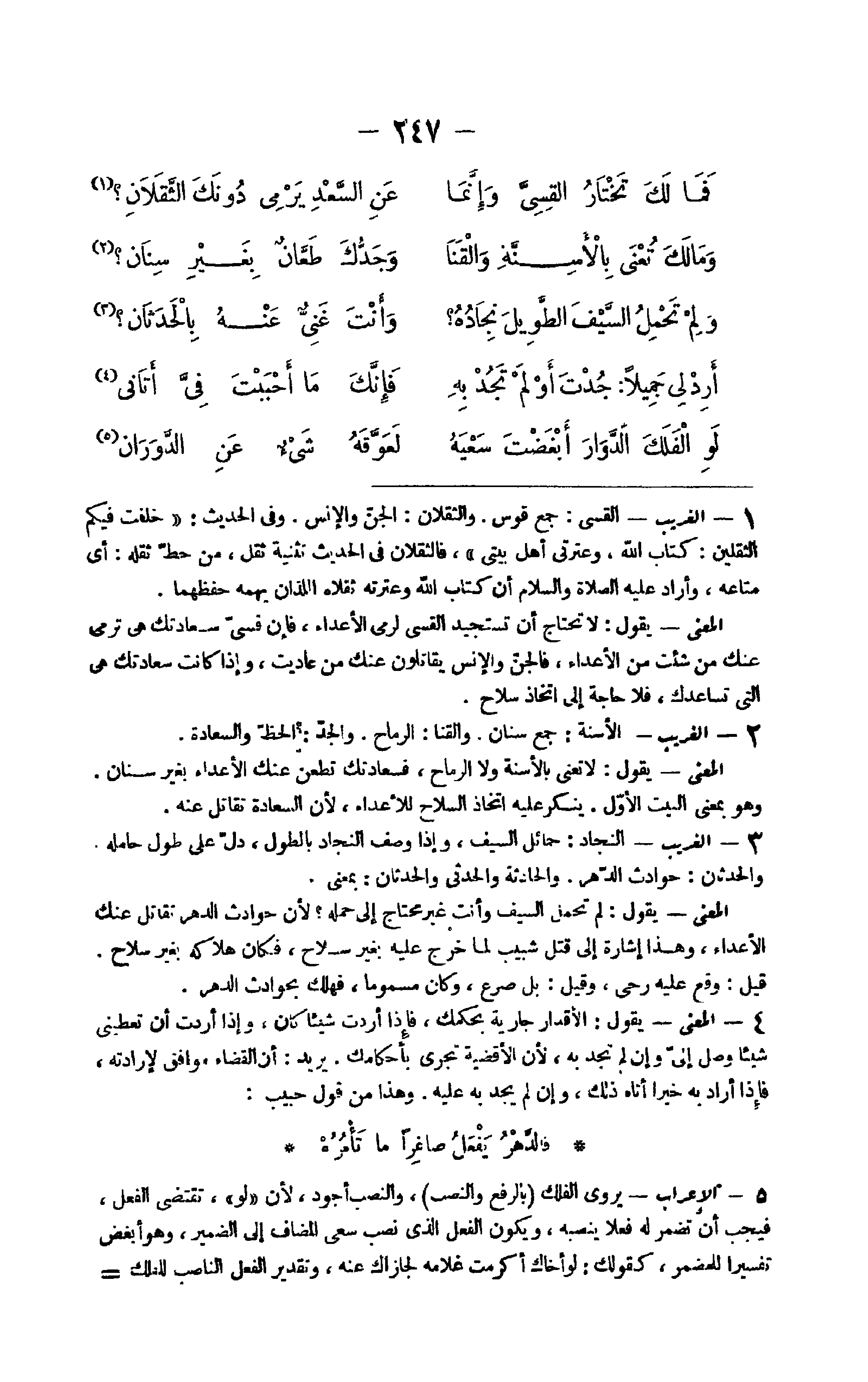 23 - الْغَرِيب القسى جمع قَوس والثقلان الْجِنّ وَالْإِنْس وَفِي الحَدِيث خلقت فِيكُم الثقلَيْن كتاب الله وعترتي أهل بَيْتِي فالثقلان فِي الحَدِيث نثنية ثقل من حط ثقله أَي مَتَاعه وَأَرَادَ عَلَيْهِ الصَّلَاة وَالسَّلَام أَن كتاب الله وعترته ثقلاه اللَّذَان يهمه حفظهما الْمَعْنى يَقُول لَا تحْتَاج أَن تستجيد القسى لرمى الْأَعْدَاء فَإِن قسى سعادتك هِيَ ترمي عَنْك من شِئْت من الْأَعْدَاء فالجن وَالْإِنْس يُقَاتلُون عَنْك من عاديت وَإِذا كَانَت سعادتك هِيَ الَّتِي تساعدك فَلَا حَاجَة إِلَى اتِّخَاذ سلَاح