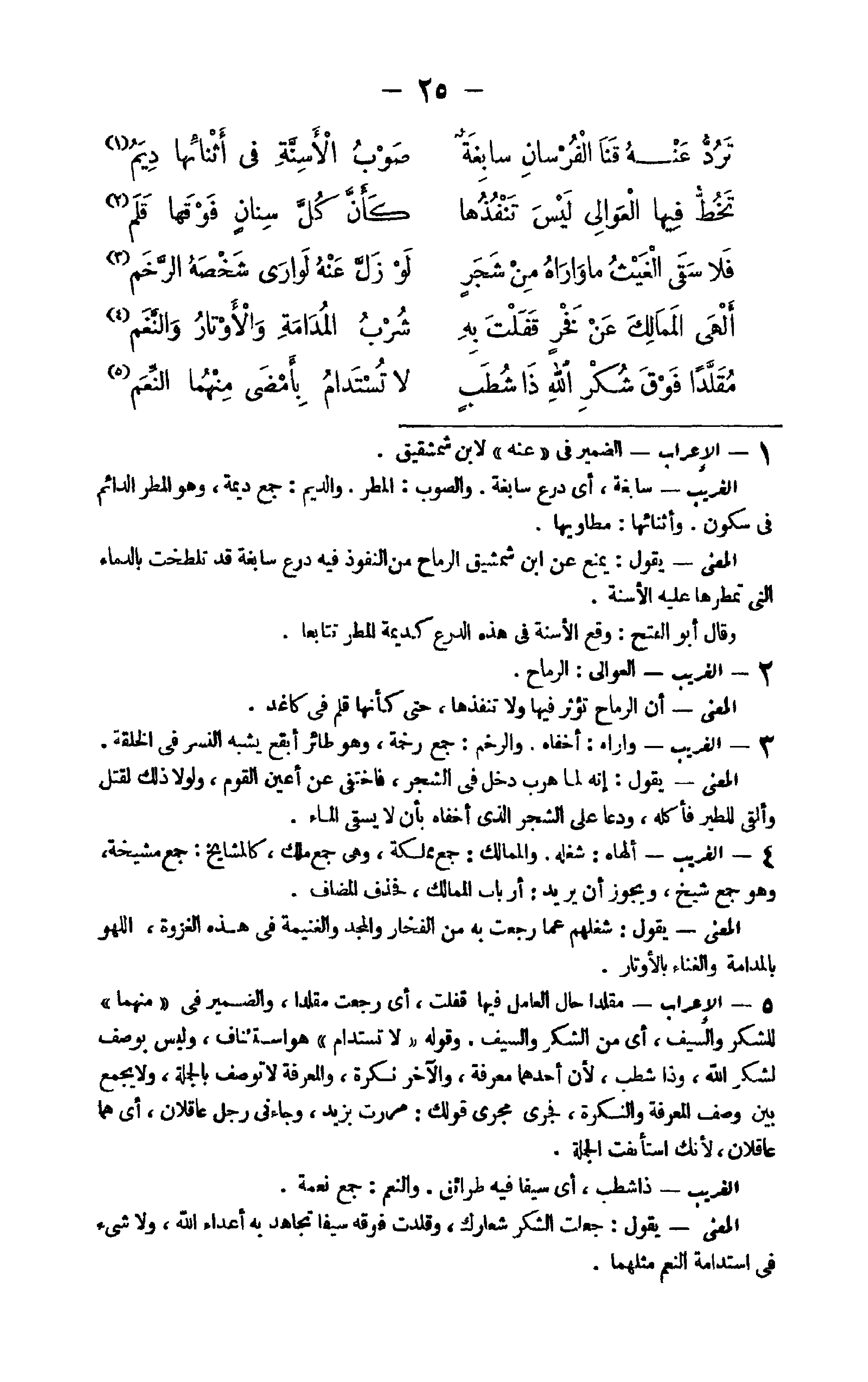 48 - الْإِعْرَاب مُقَلدًا حَال الْعَامِل فِيهَا قفلت أَي رجعت مُقَلدًا وَالضَّمِير فِي مِنْهُمَا للشكر وَالسيف أَي من الشُّكْر وَالسيف وَقَوله لَا تستدام هُوَ اسْتِئْنَاف وَلَيْسَ بِوَصْف لشكر الله وَذَا شطب لِأَن أَحدهمَا معرفَة وَالْآخر نكرَة والمعرفة لَا تُوصَف وَالْجُمْلَة وَلَا يجمع بَين وصف الْمعرفَة والنكرة فَجرى مجْرى قَوْلك مَرَرْت بزيد وَجَاءَنِي رجل عاقلان أَي هما عاقلان لِأَنَّك استأنفت الْجُمْلَة الْغَرِيب ذَا شطب أَي سَيْفا فِيهِ طرائق وَالنعَم جمع نعْمَة المعني يَقُول جعلت الشُّكْر شعارك وقلدت فَوْقه سَيْفا تُجَاهِد بِهِ أَعدَاء الله وَلَا شَيْء فِي اسْتِدَامَة النعم مثلهَا