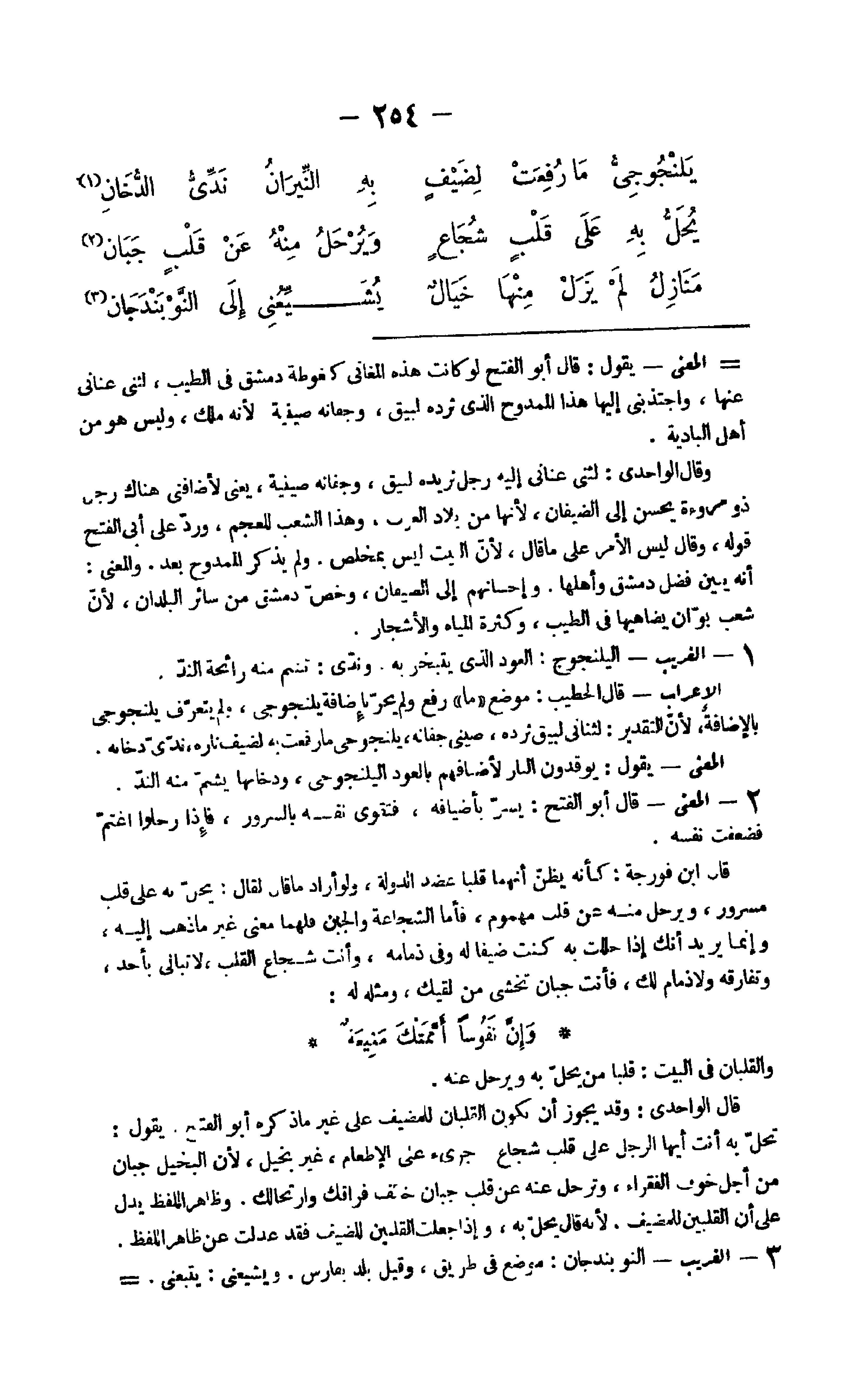 12 - الْمَعْنى قَالَ أَبُو الْفَتْح يسر بأضيافه فتقوى نَفسه بالسرور فَإِذا رحلوا اغتنم فضعفت نَفسه قَالَ ابْن فورجة كَأَنَّهُ يظنّ أَنَّهُمَا قلبا عضد الدولة وَلَو أَرَادَ مَا قَالَ لقَالَ يجل بِهِ على قلب مسرور ويرحل مِنْهُ عَن قلب مهموم فَأَما الشجَاعَة والجبن فَلَهُمَا معنى غير غير مَا ذهب إِلَيْهِ وَإِنَّمَا يُرِيد أَنَّك إِذا حللت بِهِ كنت ضيفا لَهُ وَفِي ذمامه وَأَنت شُجَاع الْقلب لَا تبالي بِأحد وتفارقه وَلَا ذمام لَك فَأَنت جبان تخشى من لقيك وَمثله لَهُ