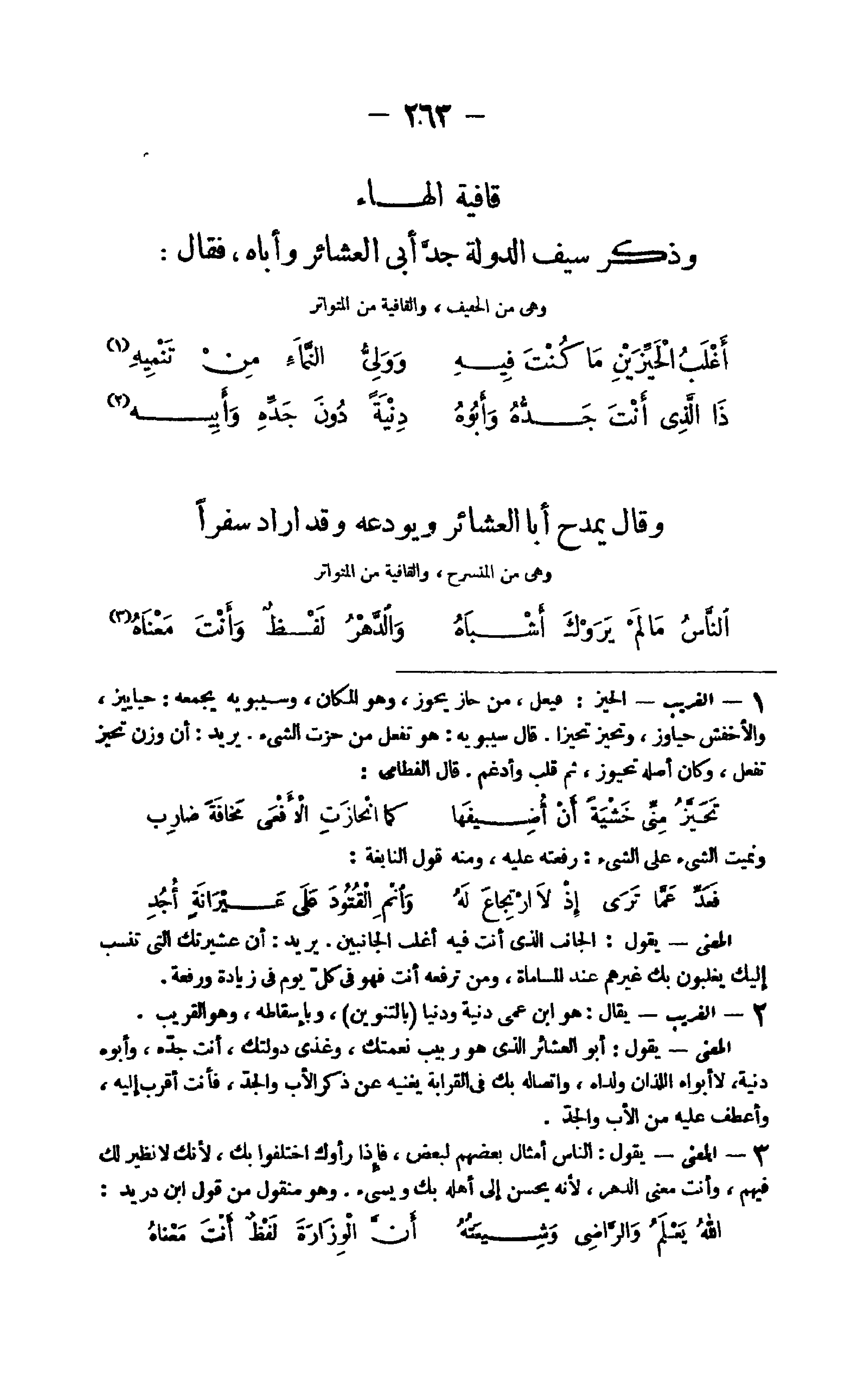 2 - الْغَرِيب يُقَال هُوَ ابْن عمي دنية وَدُنْيا بِالتَّنْوِينِ وبإسقاطه وَهُوَ الْقَرِيب الْمَعْنى يَقُول أَبُو العشائر الَّذِي هُوَ ربيب نِعْمَتك وغذى دولتك أَنْت جده وَأَبوهُ دنية لَا أَبَوَاهُ اللَّذَان ولداه واتصاله بك فِي الْقَرَابَة يُغْنِيه عَن ذكر الْأَب وَالْجد فَأَنت أقرب إِلَيْهِ وأعطف عَلَيْهِ من الْأَب وَالْجد