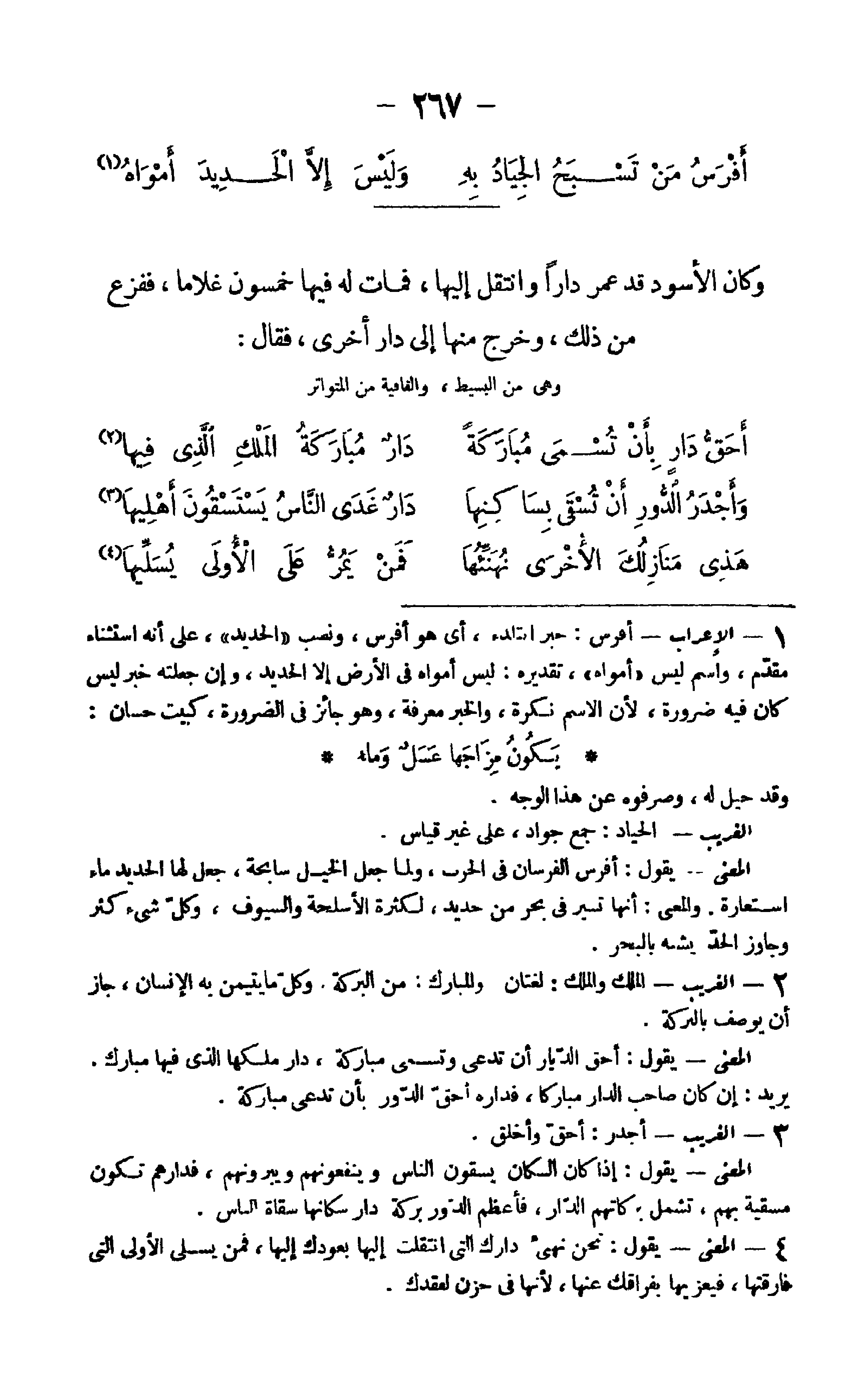 - 1 الْغَرِيب الْملك وَالْملك لُغَتَانِ وَالْمبَارك من الْبركَة وكل مَا يتيمن بِهِ الْإِنْسَان جَازَ أَن يُوصف بِالْبركَةِ الْمَعْنى يَقُول أَحَق الديار أَن تدعى وَتسَمى مباركة دَار ملكهَا الَّذِي فِيهَا مبارك يُرِيد إِن كَانَ صَاحب الدَّار مُبَارَكًا فداره أَحَق الدّور بِأَن تدعى مباركة