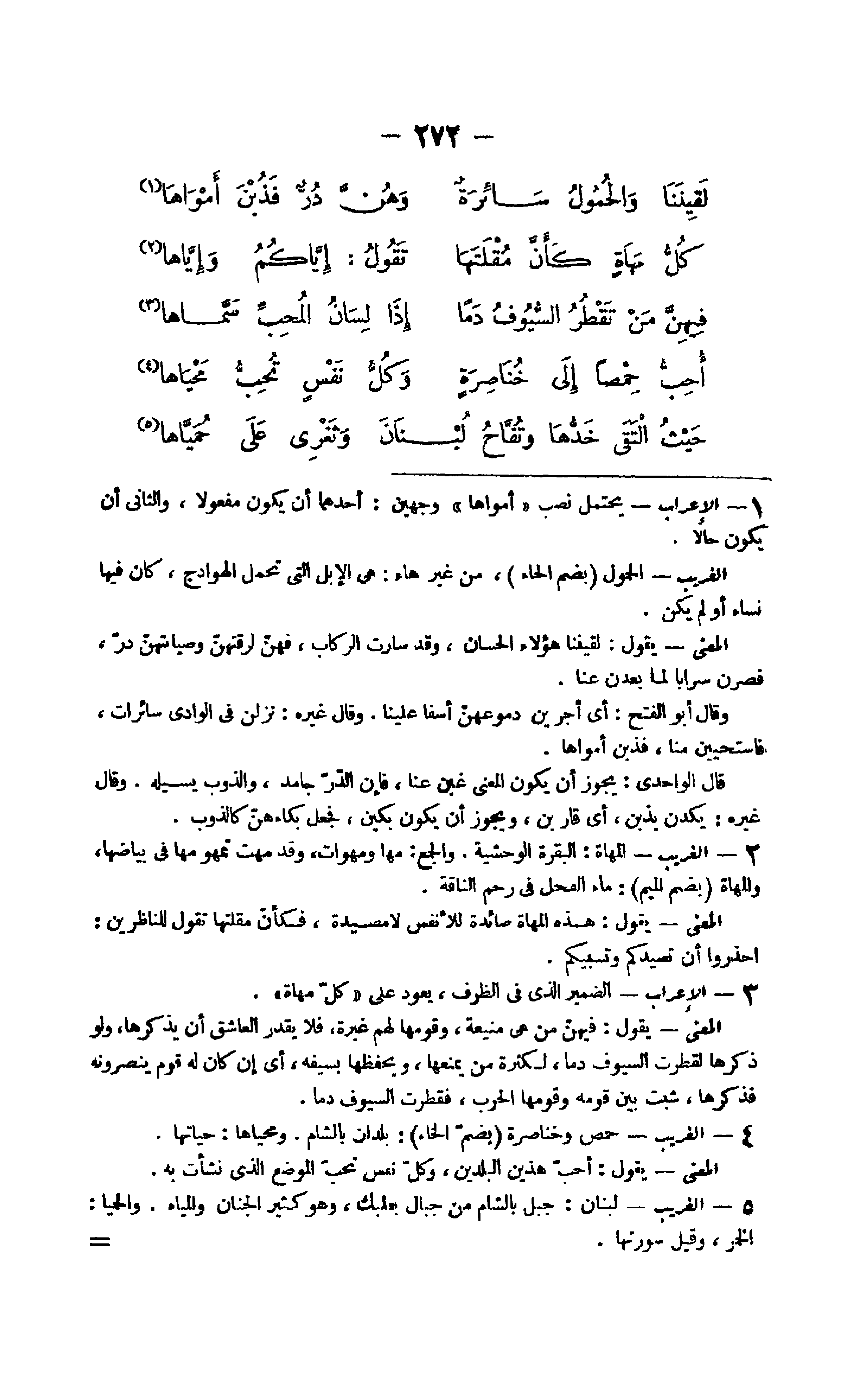 12 - الْإِعْرَاب الضَّمِير الَّذِي فِي الظّرْف يعود على كل مهاة الْمَعْنى يَقُول فِيهِنَّ من هِيَ منيعة وقومها لَهُم غيرَة فَلَا يقدر العاشق أَن يذكرهَا وَلَو ذكرهَا لقطرت السيوف دَمًا لِكَثْرَة من يمْنَعهَا ويحفظها بِسَيْفِهِ أَي إِن كَانَ لَهُ قوم ينصرونه فَذكرهَا شبت بَين قومه وقومها الْحَرْب فقطرت السيوف دَمًا