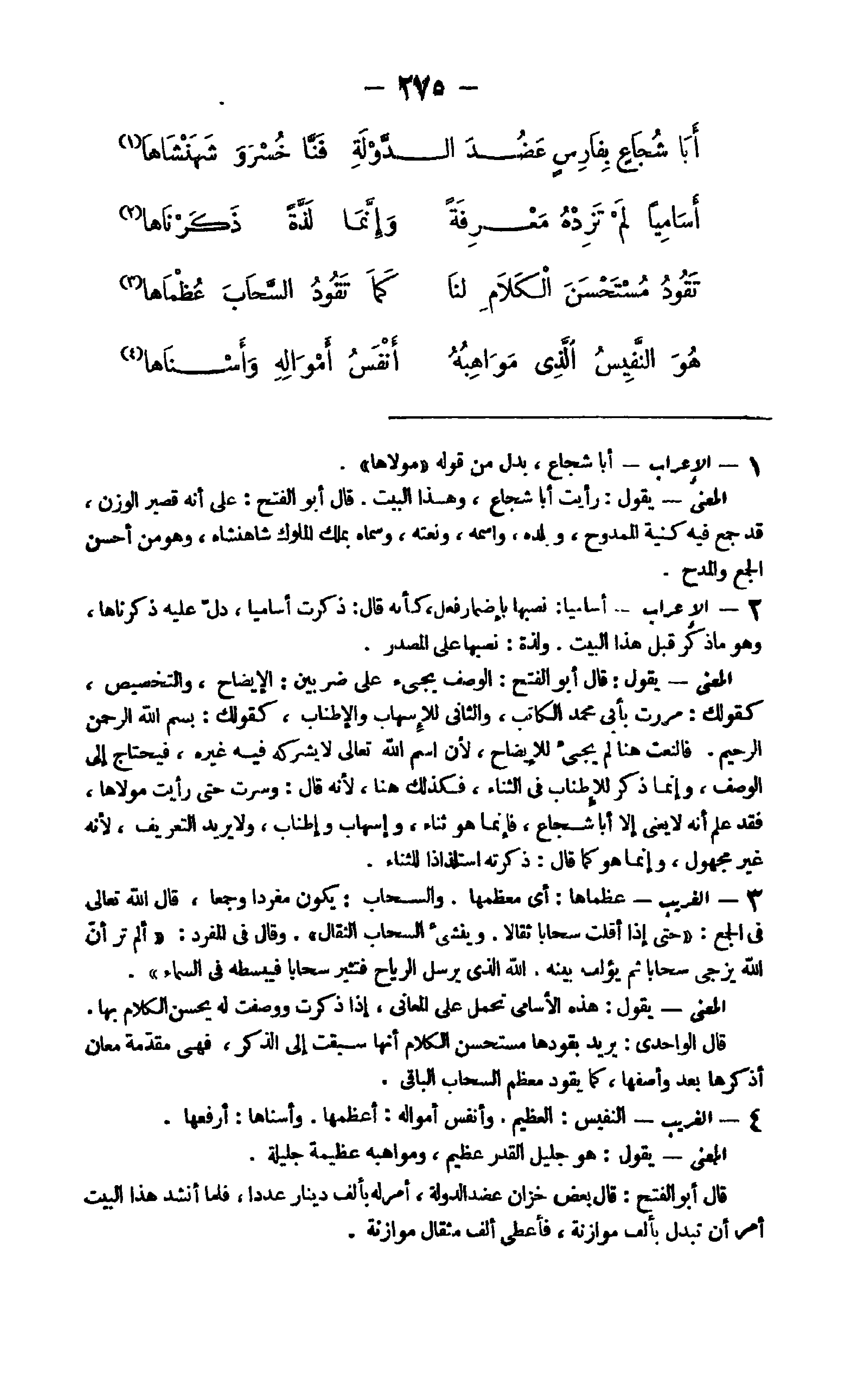 - الْإِعْرَاب أَبَا شُجَاع بدل من قَوْله مَوْلَاهَا الْمَعْنى يَقُول رَأَيْت أَبَا شُجَاع وَهَذَا الْبَيْت قَالَ أَبُو الْفَتْح على أَنه قصير الْوَزْن قد جمع فِيهِ كنية الممدوح وبلده واسْمه ونعته وَسَماهُ بِملك الْمُلُوك شاهنشاه وَهُوَ من أحسن الْجمع والمدح