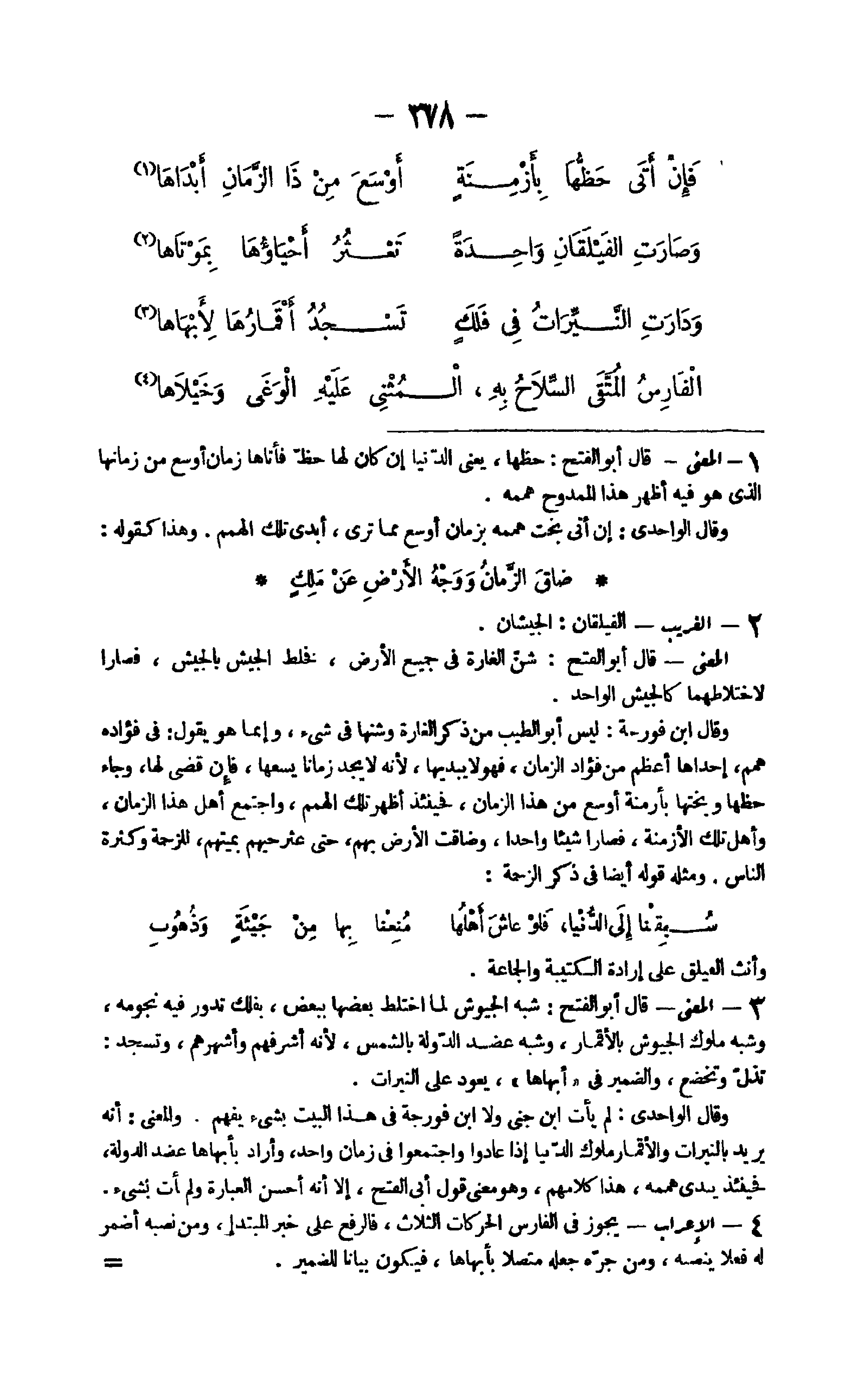 37 - الْغَرِيب الفليقان الجيشان الْمَعْنى قَالَ أَبُو الْفَتْح شن الْغَارة فِي جَمِيع الأَرْض فخلط الْجَيْش بالجيش فصارا لاختلاطهما كالجيش الْوَاحِد وَقَالَ ابْن فورجة لَيْسَ أَبُو الطّيب من ذكر الْغَارة وشنها فِي شَيْء وَإِنَّمَا هُوَ يَقُول فِي فُؤَاده همم إِحْدَاهَا أعظم من فؤاد الزَّمَان فَهُوَ لَا يبديها لِأَنَّهُ لَا يجد زَمَانا يَسعهَا فَإِن قضى لَهَا وَجَاء حظها وبختها بأزمنة أوسع من هَذَا الزَّمَان فَحِينَئِذٍ أظهر تِلْكَ الهمم وَاجْتمعَ أهل هَذَا الزَّمَان وَأهل تِلْكَ الْأَزْمِنَة فَصَارَ شَيْئا وَاحِدًا وَضَاقَتْ الأَرْض بهم حَتَّى عثر حيهم بميتهم للزحمة وَكَثْرَة النَّاس وَمثله قَوْله أَيْضا فِي ذكر الزحمة