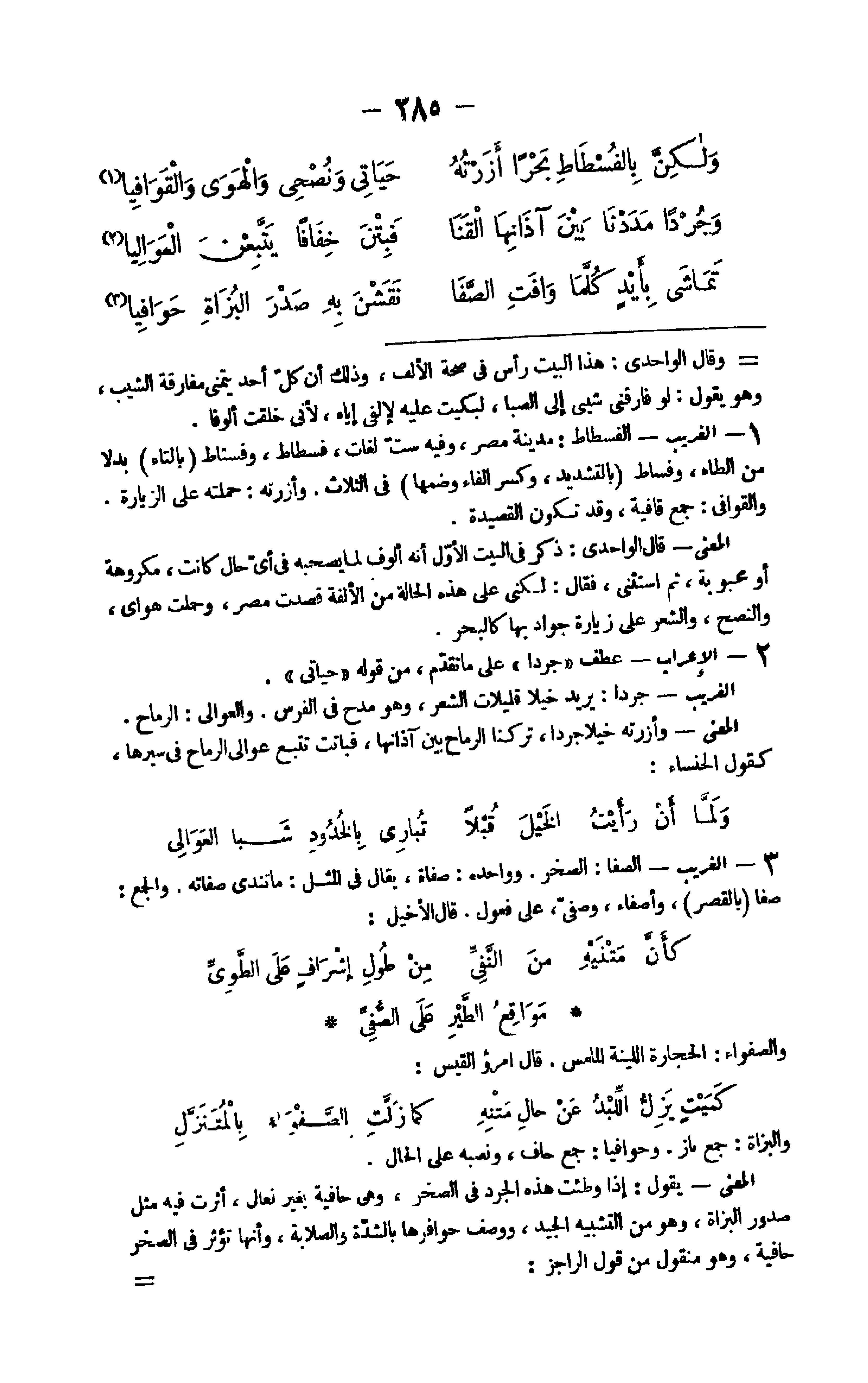 13 - الْغَرِيب الْفسْطَاط مَدِينَة مصر وَفِيه سِتّ لُغَات فسطاط وفستاط بِالتَّاءِ بَدَلا من الطَّاء وفساط بِالتَّشْدِيدِ وَكسر الْفَاء وَضمّهَا فِي الثَّلَاث وأزرته حَملته على الزِّيَارَة والقوافي جمع قافية وَقد تكون القصيدة الْمَعْنى قَالَ الواحدي ذكر فِي الْبَيْت الأول أَنه أُلُوف لما يَصْحَبهُ فِي أَي حَال كَانَت مَكْرُوهَة أَو محبوبة ثمَّ اسْتثْنى فَقَالَ لكني على هَذِه الْحَالة من الألفة قصدت مصر وحملت هواي والنصح وَالشعر على زِيَارَة جواد بهَا كالبحر