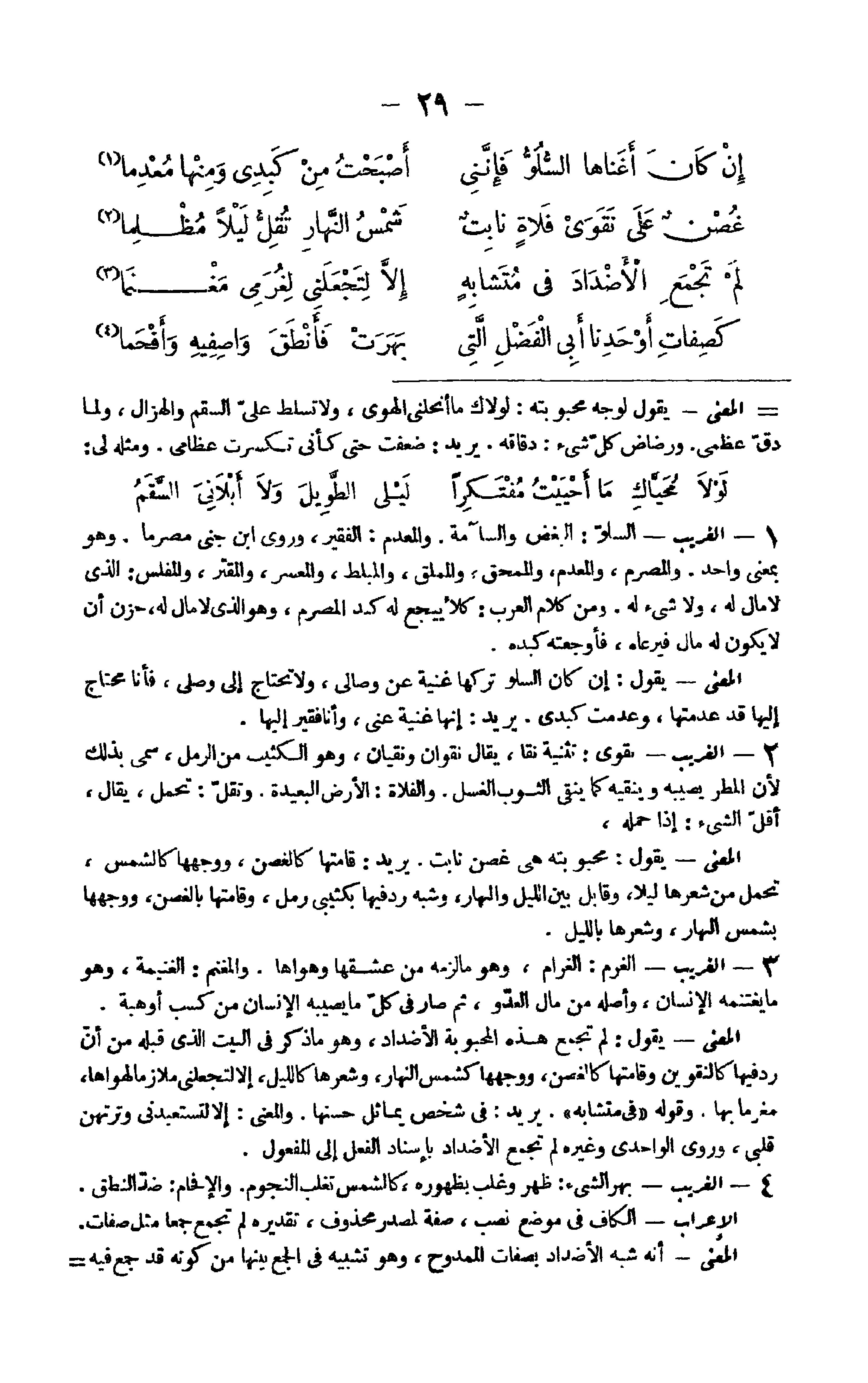 6 - الْغَرِيب السلوّ البغض والسآمة والمعدم الْفَقِير وروى ابْن جنى مصرما وَهُوَ بِمَعْنى وَاحِد والمصرم والمعدم والممحق والمماق والمبلط والمعسر والمفتر والمفلس الَّذِي لَا مَال لَهُ وَلَا شَيْء لَهُ وَمن كَلَام الْعَرَب كلأ يبجع لَهُ كبد المصرم وَهُوَ الَّذِي لَا مَال لَهُ حزن أَن لَا يكون لَهُ مَال فيرعاه فأوجعته كبده الْمَعْنى يَقُول إِن كَانَ السلوّ تَركهَا غنية عَن وصالي وَلَا تحْتَاج إِلَى وَصلي فَأَنا مُحْتَاج إِلَيْهَا قد عدمتها وعدمت كَبِدِي يُرِيد إِنَّهَا غنية عني وَأَنا فَقير إِلَيْهَا