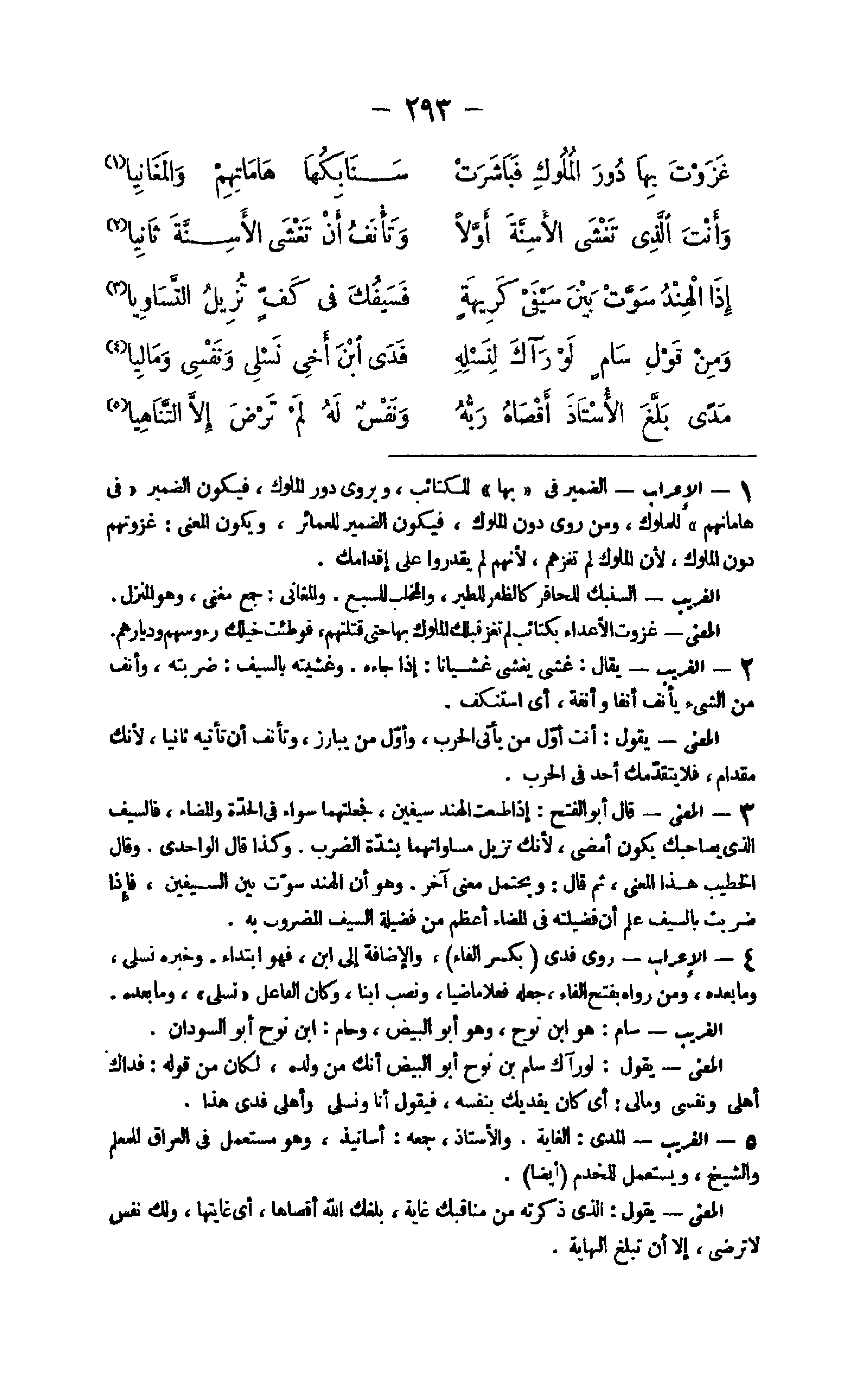 - الْأَعْرَاب الضَّمِير فِي بهَا للكتائب ويروى دور الْمُلُوك فَيكون الضَّمِير فِي هاماتهم للملوك لِأَن الْمُلُوك لم تغزهم لأَنهم لم يقدروا على إقدامك وَمن روى دون الْمُلُوك فَيكون الضَّمِير للعمائر وَيكون غزوتهم دون الْمُلُوك الْغَرِيب السنبك للحافر كالظفر للطير والمخلب للسبع والمغاني جمع مغنى وَهُوَ الْمنزل الْمَعْنى غزوت الْأَعْدَاء بكتائب لم تغز قبلك الْمُلُوك بهَا حَتَّى قَتلتهمْ فوطئت خيلك رُءُوسهم وديارهم