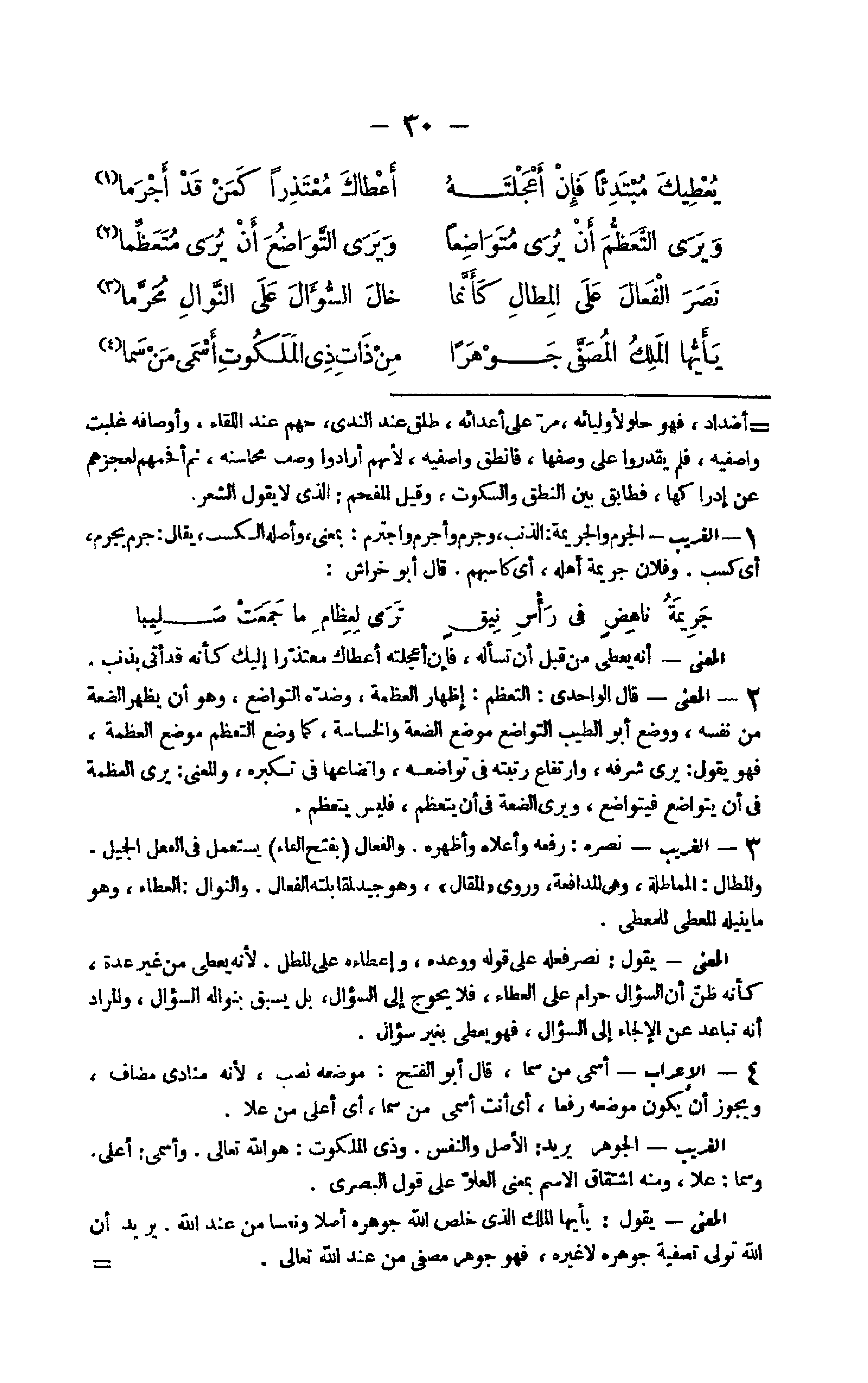 13 - الْإِعْرَاب أسمى من سما قَالَ أَبُو الْفَتْح مَوْضِعه نصب لِأَنَّهُ منادى مُضَاف وَيجوز أَن يكون مَوْضِعه رفعا أَي أَنْت أسمى من سما أَي أَعلَى من علا الْغَرِيب الْجَوْهَر يُرِيد الأَصْل وَالنَّفس وَذي الملكوت هُوَ الله تَعَالَى وأسمى أَعلَى وسما علا وَمِنْه اشتقاق الِاسْم بِمَعْنى الْعُلُوّ على قَول الْبَصْرِيّ الْمَعْنى يَقُول يَا أَيهَا الْملك الَّذِي خلص الله جوهره أصلا ونفسا من عِنْد الله يُرِيد أَن الله تولى تصفية جوهره لَا غَيره فَهُوَ جَوْهَر مصفى من عِنْد الله تَعَالَى