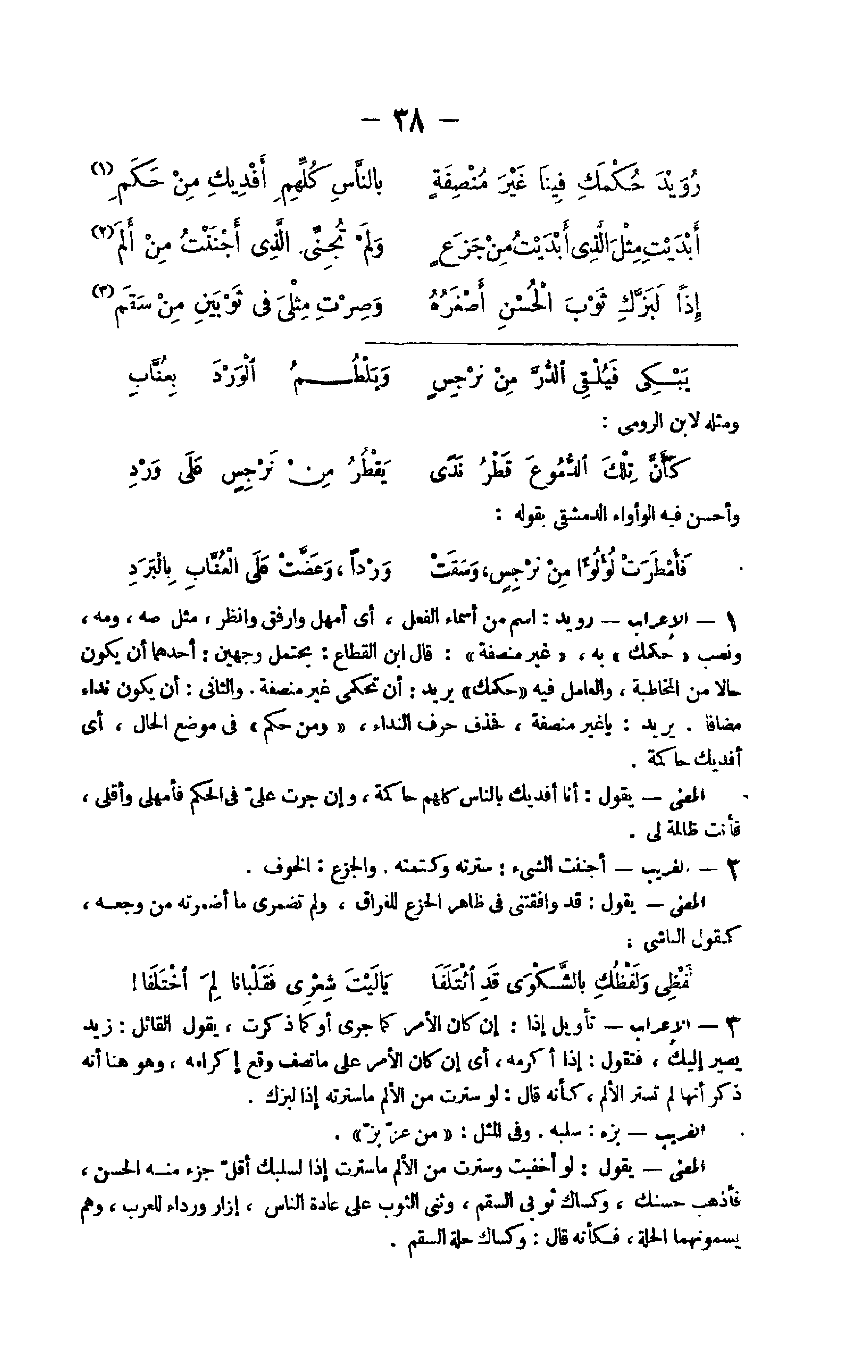 9 - الْإِعْرَاب رويد اسْم من أَسمَاء الْفِعْل أَي أمْهل وارفق وَانْظُر مثل صه ومه وَنصب حكمك بِهِ غير منصفه قَالَ ابْن القطاع يحْتَمل وَجْهَيْن أَحدهمَا أَن يكون حَالا من المخاطبة وَالْعَامِل فِيهِ حكمك يُرِيد أَن تحكمي غير منصفة وَالثَّانِي أَن يكون نِدَاء مُضَافا يُرِيد يَا غير منصفة فَحذف حرف النداء وَمن حكم فِي مَوضِع الْحَال أَي أفديك حاكمة الْمَعْنى يَقُول أَنا أفديك بِالنَّاسِ كلهم حاكمة وَإِن جرت عَليّ فِي الحكم فأمهلي وأقلي فَأَنت ظالمة لي