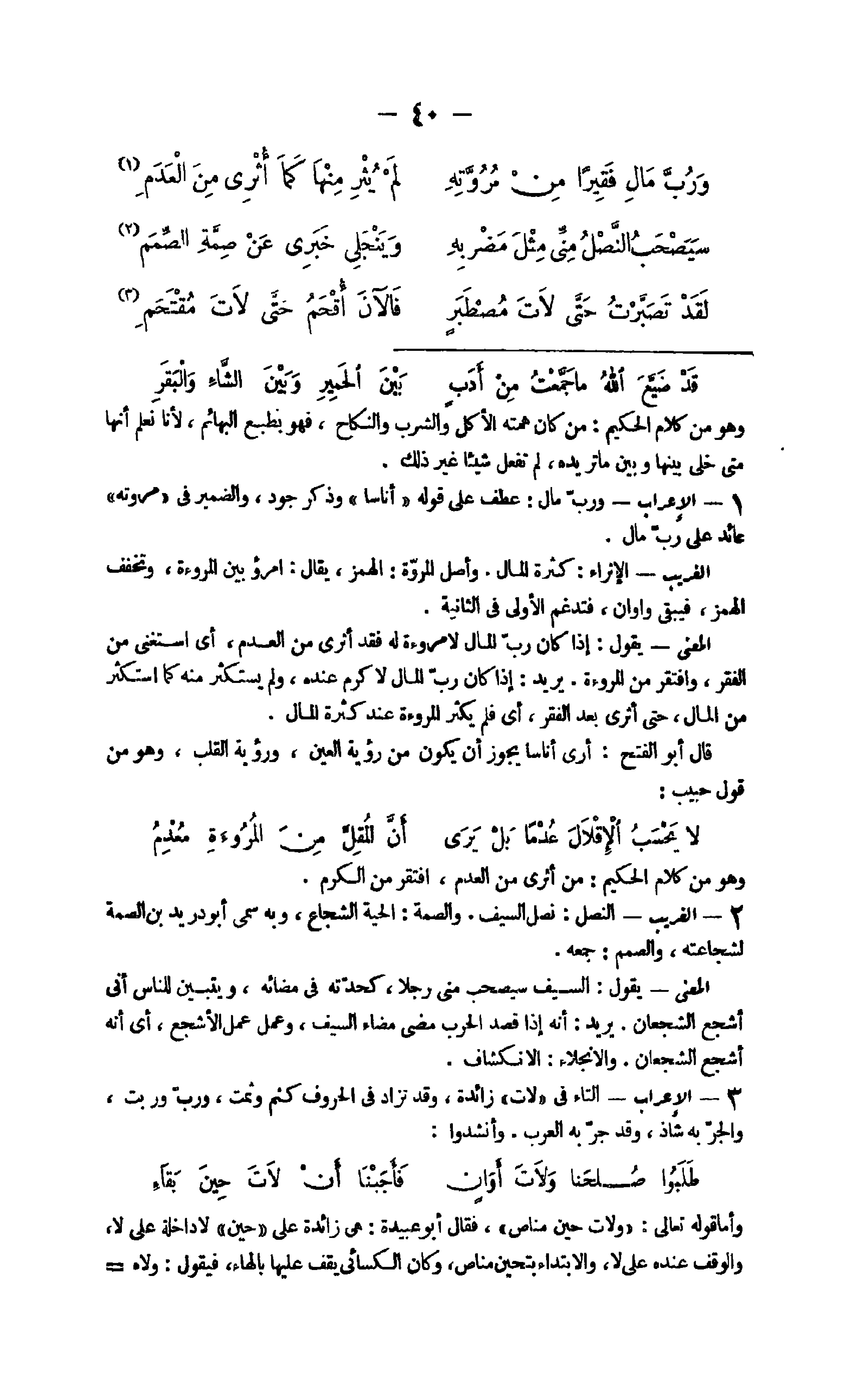 16 - الْإِعْرَاب وَرب مَال عطف على قَوْله أُنَاسًا وَذكر جود وَالضَّمِير فِي مروته عَائِد على رب مَال الْغَرِيب الإثراء كَثْرَة المَال وأصل الْمَرْوَة الْهَمْز يُقَال امْرُؤ بَين الْمُرُوءَة وتخفف الْهَمْز فَيبقى واوان فتدغم الأولى فِي الثَّانِيَة الْمَعْنى يَقُول إِذا كَانَ رب المَال لَا مُرُوءَة لَهُ فقد أثري من الْعَدَم أَي اسْتغنى من الْفقر وافتقر من الْمُرُوءَة يُرِيد إِذا كَانَ رب المَال لَا كرم عِنْده وَلم يستكثر مِنْهُ كَمَا استكثر من المَال حَتَّى أثرى بعد الْفقر أَي فَلم يكثر الْمُرُوءَة عِنْد كَثْرَة المَال قَالَ أَبُو الْفَتْح أرى أُنَاسًا يجوز أَن يكون من رُؤْيَة الْعين ورؤية الْقلب وَهُوَ من قَول حبيب