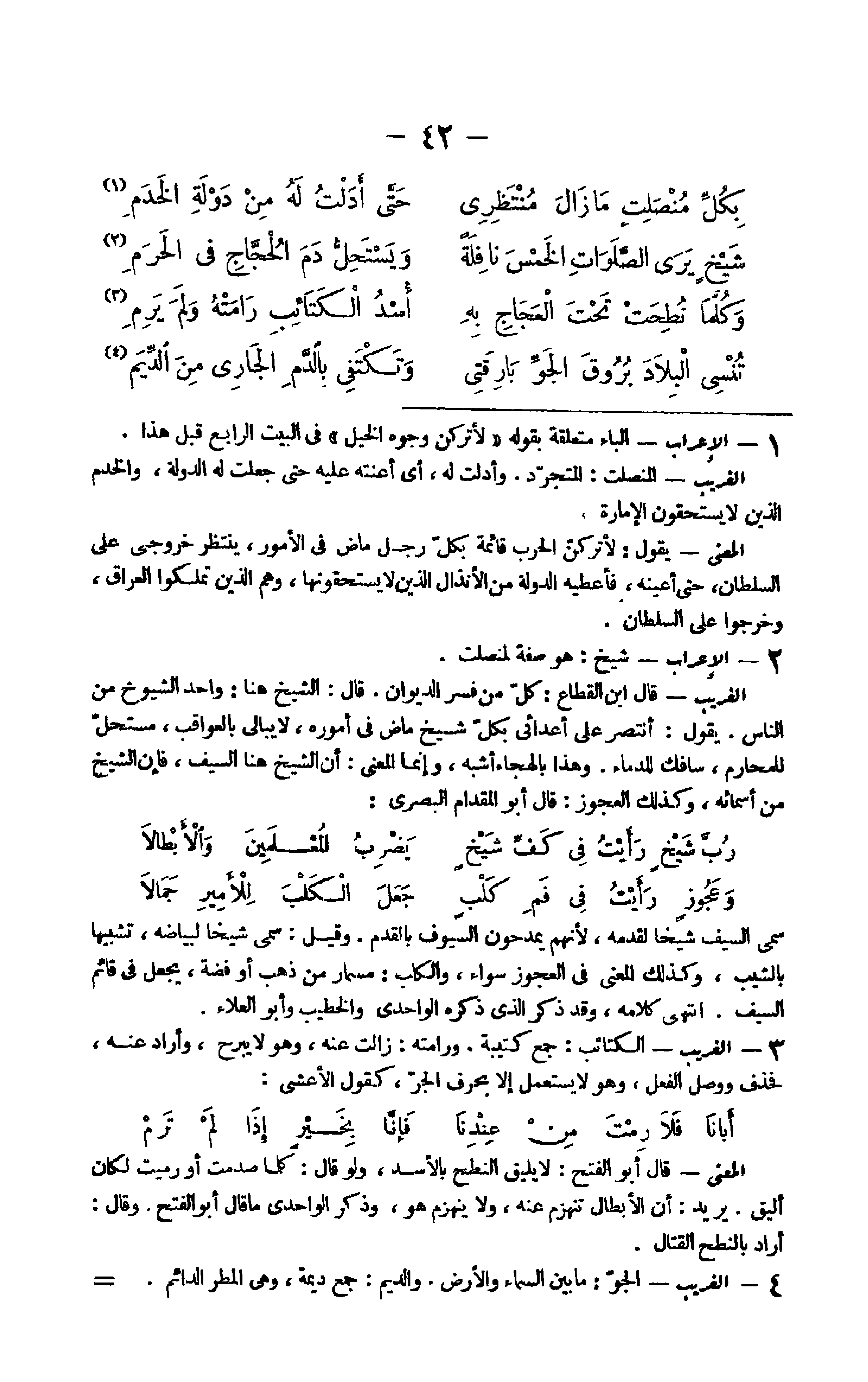 23 - الْإِعْرَاب شيخ هُوَ صفة لمنصلت الْغَرِيب قَالَ ابْن القطاع كل من فسر الدِّيوَان قَالَ الشَّيْخ هُنَا وَاحِد الشُّيُوخ من النَّاس يَقُول انتصر على أعدائي بِكُل شيخ مَاض فِي أُمُوره لَا يُبَالِي بالعواقب مستحل للمحارم سافك للدماء وَهَذَا بالهجاء أشبه وَإِنَّمَا الْمَعْنى أَن الشَّيْخ هُنَا السَّيْف فَإِن الشَّيْخ من أَسْمَائِهِ وَكَذَلِكَ الْعَجُوز قَالَ أَبُو الْمِقْدَام الْبَصْرِيّ