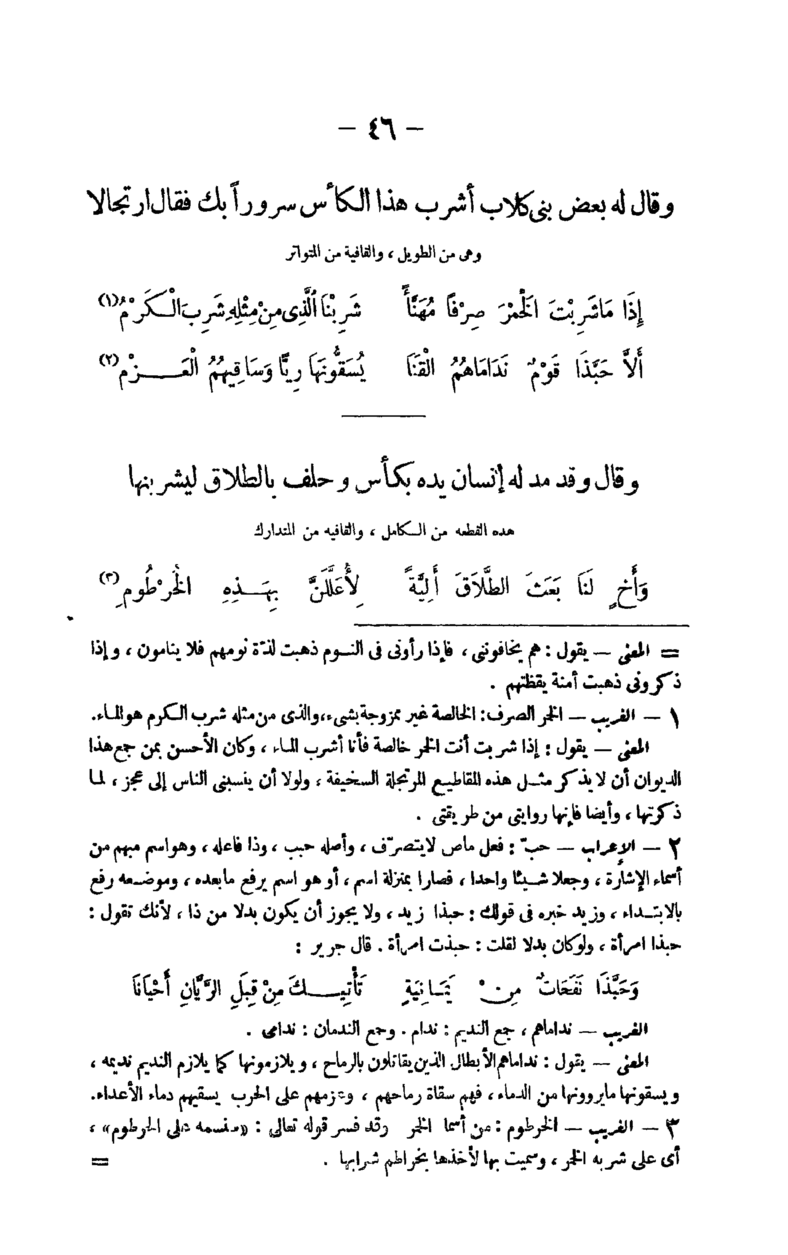 - 1 الْغَرِيب الْخمر الصّرْف الْخَالِصَة غير ممزوجة بِشَيْء وَالَّذِي من مثله شرب الْكَرم هُوَ المَاء الْمَعْنى يَقُول إِذا شربت أَنْت الْخمر خَالِصَة فَأَنا أشْرب المَاء وَكَانَ الْأَحْسَن بِمن جمع هَذَا الدِّيوَان أَن لَا يذكر مثل هَذِه المقاطيع المرتجلة السخيفة وَلَوْلَا أَن ينسبني النَّاس إِلَى عجز لما ذكرتها وَأَيْضًا فَإِنَّهَا روايتي من طريقتي
