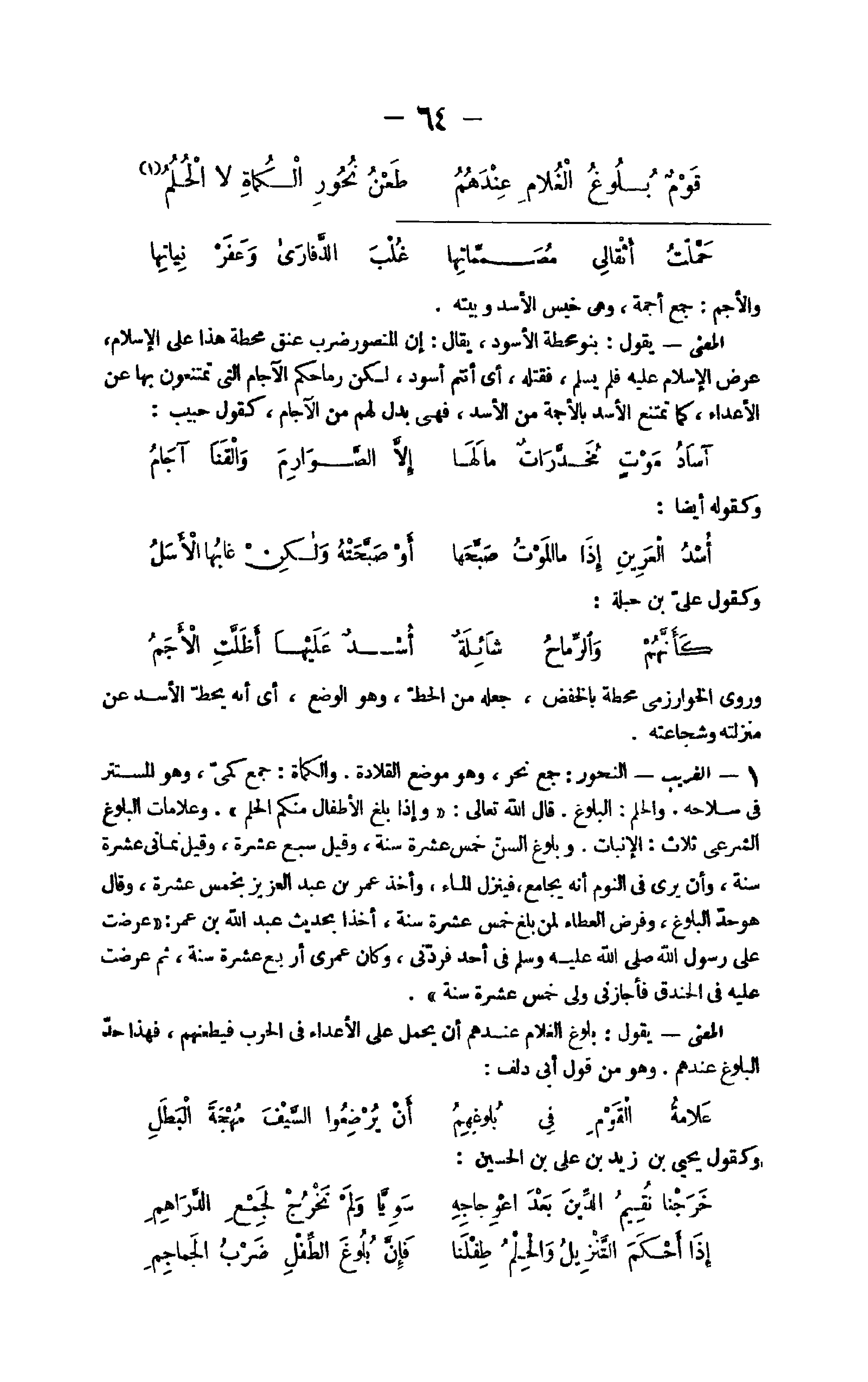 23 - الْغَرِيب النحور جمع نحر وَهُوَ مَوضِع القلادة والكماة جمع كمي وَهُوَ الْمُسْتَتر فِي سلاحه والحلم الْبلُوغ قَالَ الله تَعَالَى {وَإِذا بلغ الْأَطْفَال مِنْكُم الْحلم} وعلامات الْبلُوغ الشَّرْعِيّ ثَلَاث الإنبات وبلوغ السن خمس عشرَة سنة وَقيل سبع عشرَة وَقيل ثَمَانِي عشرَة سنة وَأَن يرى فِي النّوم أَنه بِجَامِع فَينزل المَاء وَأخذ عمر ابْن عبد الْعَزِيز بِخمْس عشرَة وَقَالَ هُوَ حد الْبلُوغ وَفرض الْعَطاء لمن بلغ خمس عشرَة سنة أخذا بِحَدِيث عبد الله بن عمر عرضت على رَسُول الله