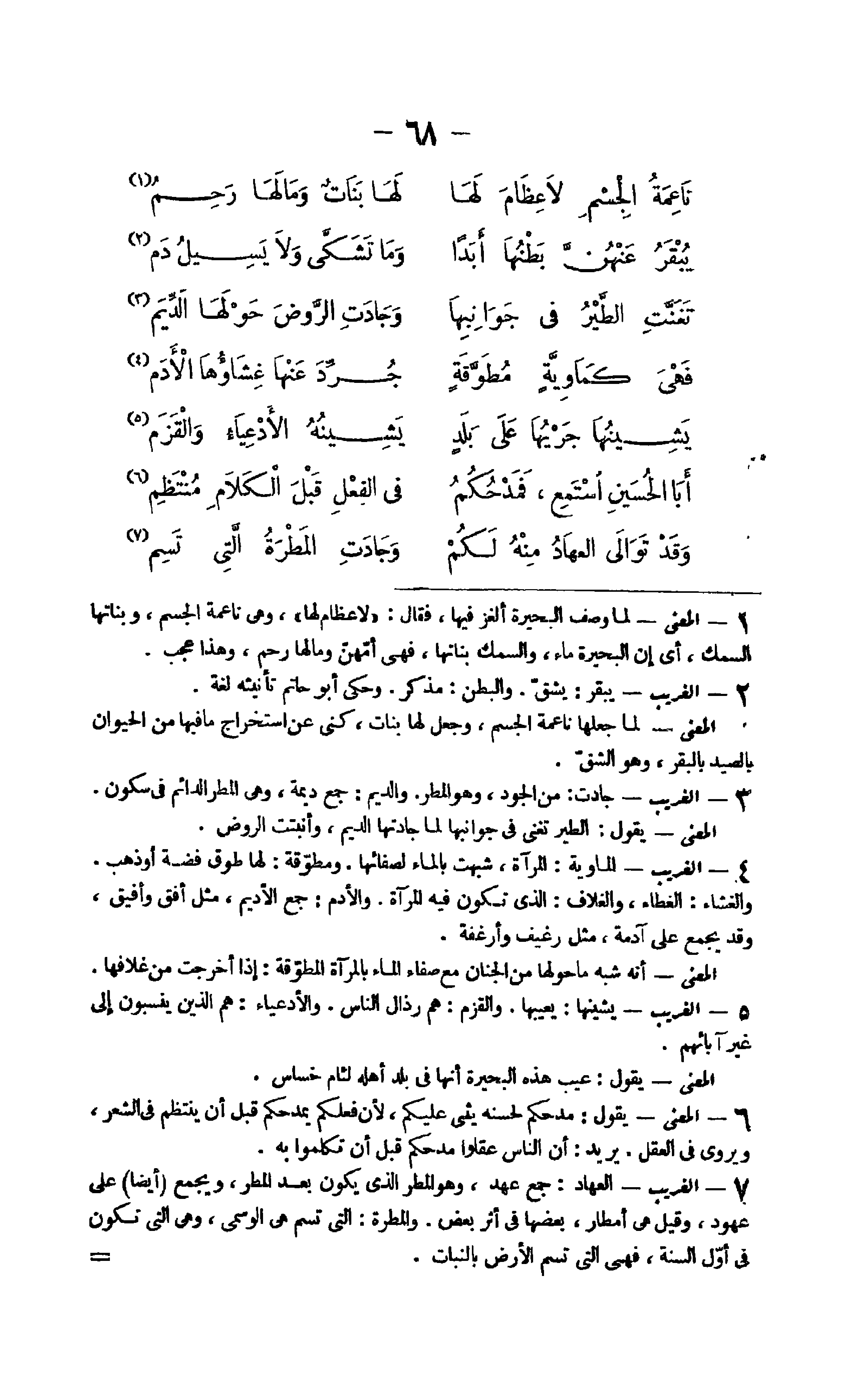 - الْمَعْنى لما وصف الْبحيرَة ألغز فِيهَا فَقَالَ لَا عِظَام لَهَا وَهِي ناعمة الْجِسْم وبناتها السّمك أَي إِن الْبحيرَة مَاء والسمك بناتها فَهِيَ أمهن وَمَا لَهَا رحم وَهَذَا عجب