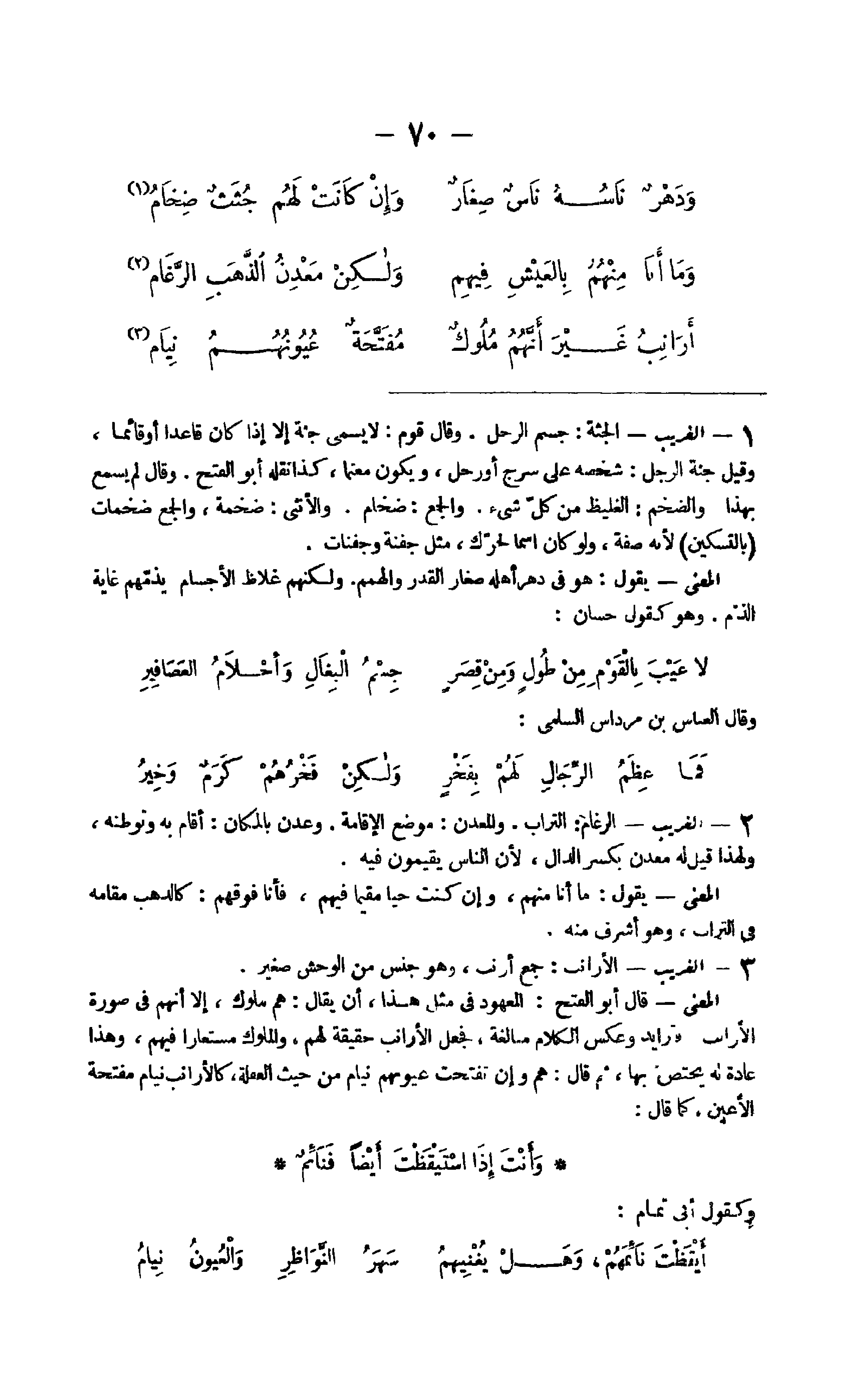 3 - الْغَرِيب الرغام التُّرَاب والمعدن مَوضِع الْإِقَامَة وعدن بِالْمَكَانِ أَقَامَ بِهِ وتوطنه وَلِهَذَا قيل لَهُ مَعْدن بِكَسْر الدَّال لِأَن النَّاس يُقِيمُونَ فِيهِ الْمَعْنى يَقُول مَا أَنا مِنْهُم وَإِن كنت حَيا مُقيما فيهم فَأَنا فَوْقهم كالذهب مقَامه فِي التُّرَاب وَهُوَ أشرف مِنْهُ