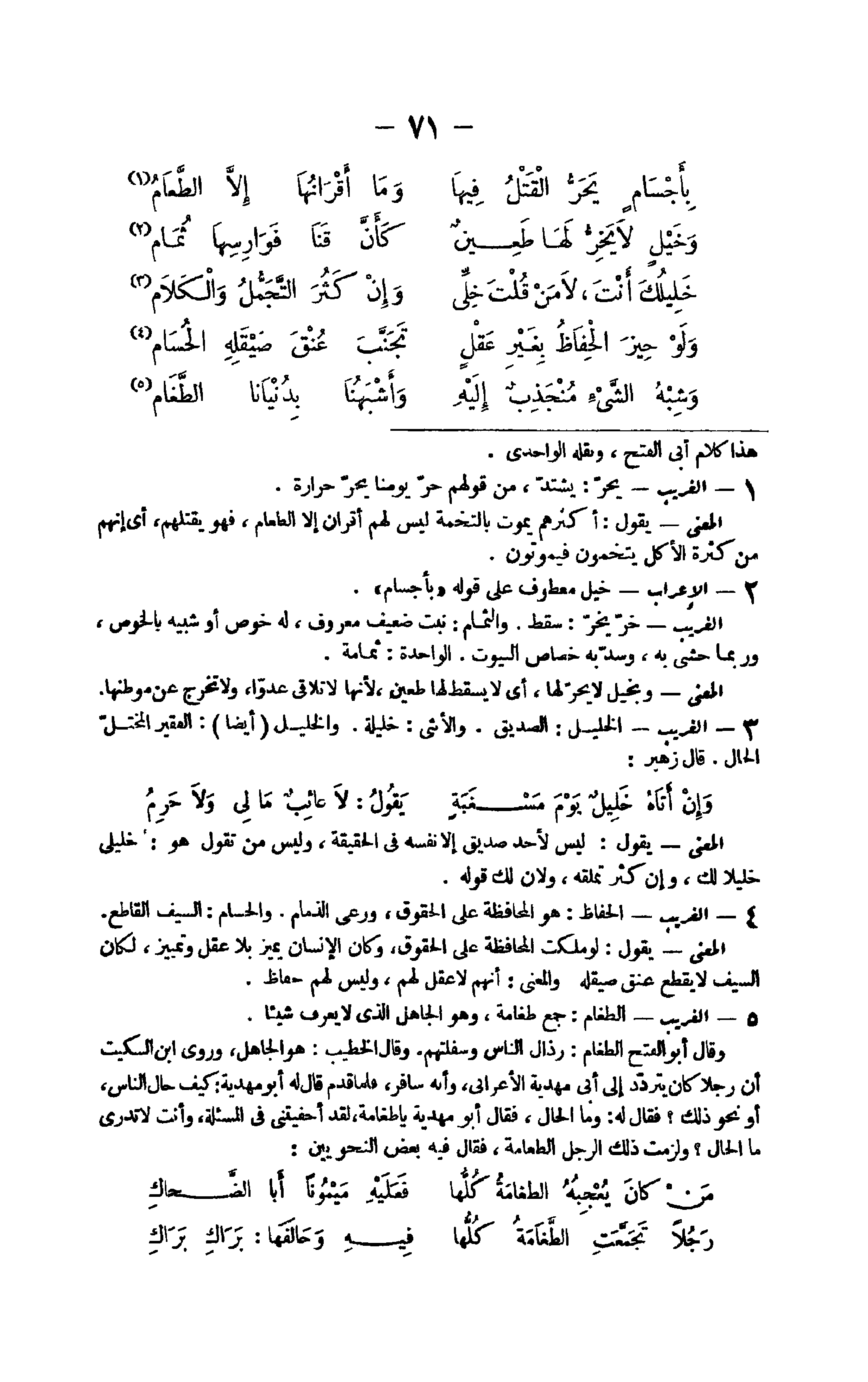 5 - الْغَرِيب يحر يشْتَد من قَوْلهم حر يَوْمنَا يجر حرارة الْمَعْنى يَقُول أَكْثَرهم يَمُوت بالتخمة لَيْسَ لَهُم أَقْرَان إِلَّا الطَّعَام فَهُوَ يقتلهُمْ أَي إِنَّهُم من كَثْرَة الْأكل يتخمون فيموتون