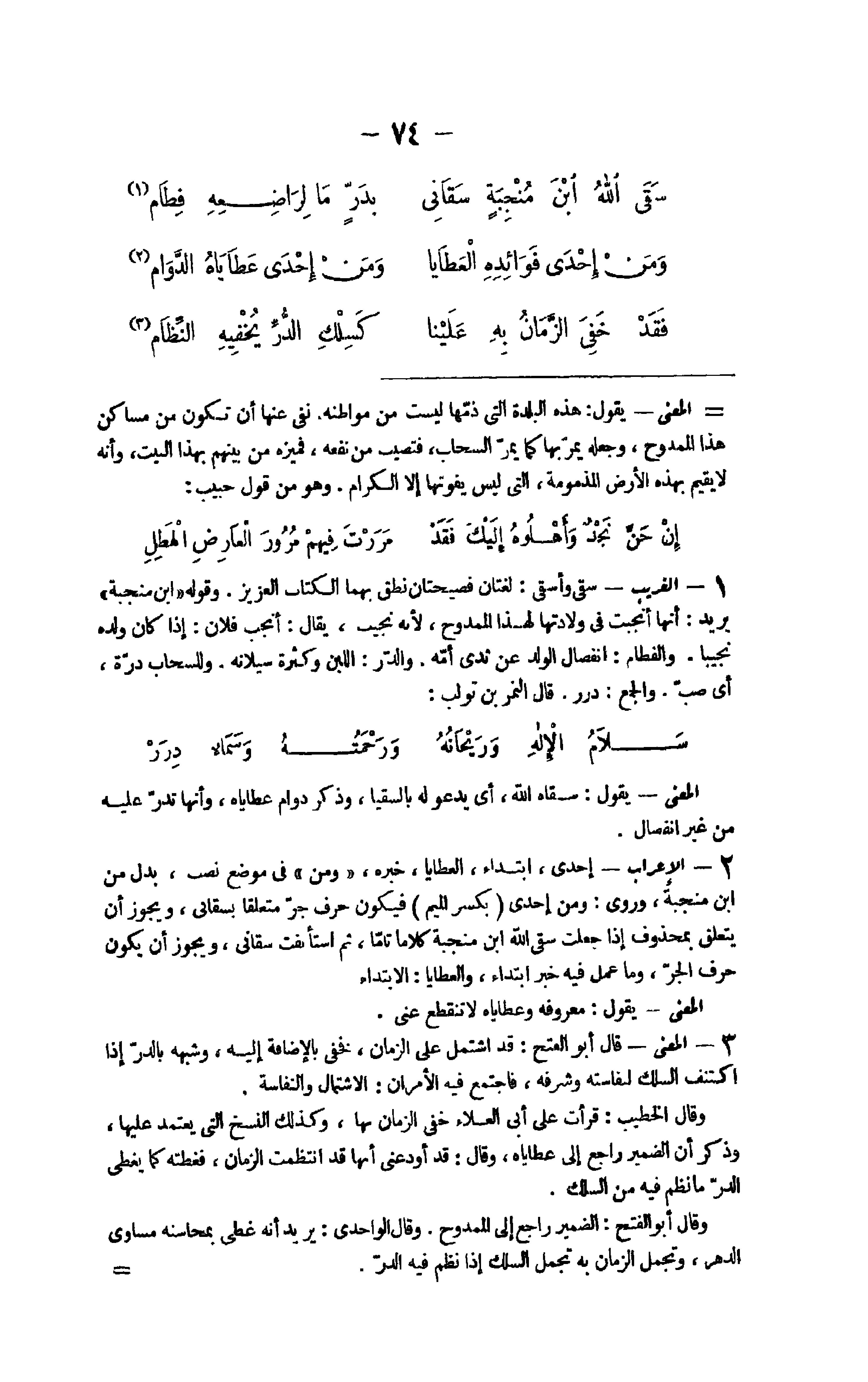 20 - الْغَرِيب سقى وأسقى لُغَتَانِ فصيحتان نطق بهما الْكتاب الْعَزِيز وَقَوله ابْن منجبة يُرِيد أَنَّهَا أنجبت فِي وِلَادَتهَا لهَذَا الممدوح لِأَنَّهُ نجيب يُقَال أَنْجَب فلَان إِذا كَانَ وَلَده نجيبا والفطام انْفِصَال الْوَلَد عَن ثدي أمه والدر اللَّبن وَكَثْرَة سيلانه وللسحاب درة أَي صب وَالْجمع دُرَر قَالَ النمر بن تولب