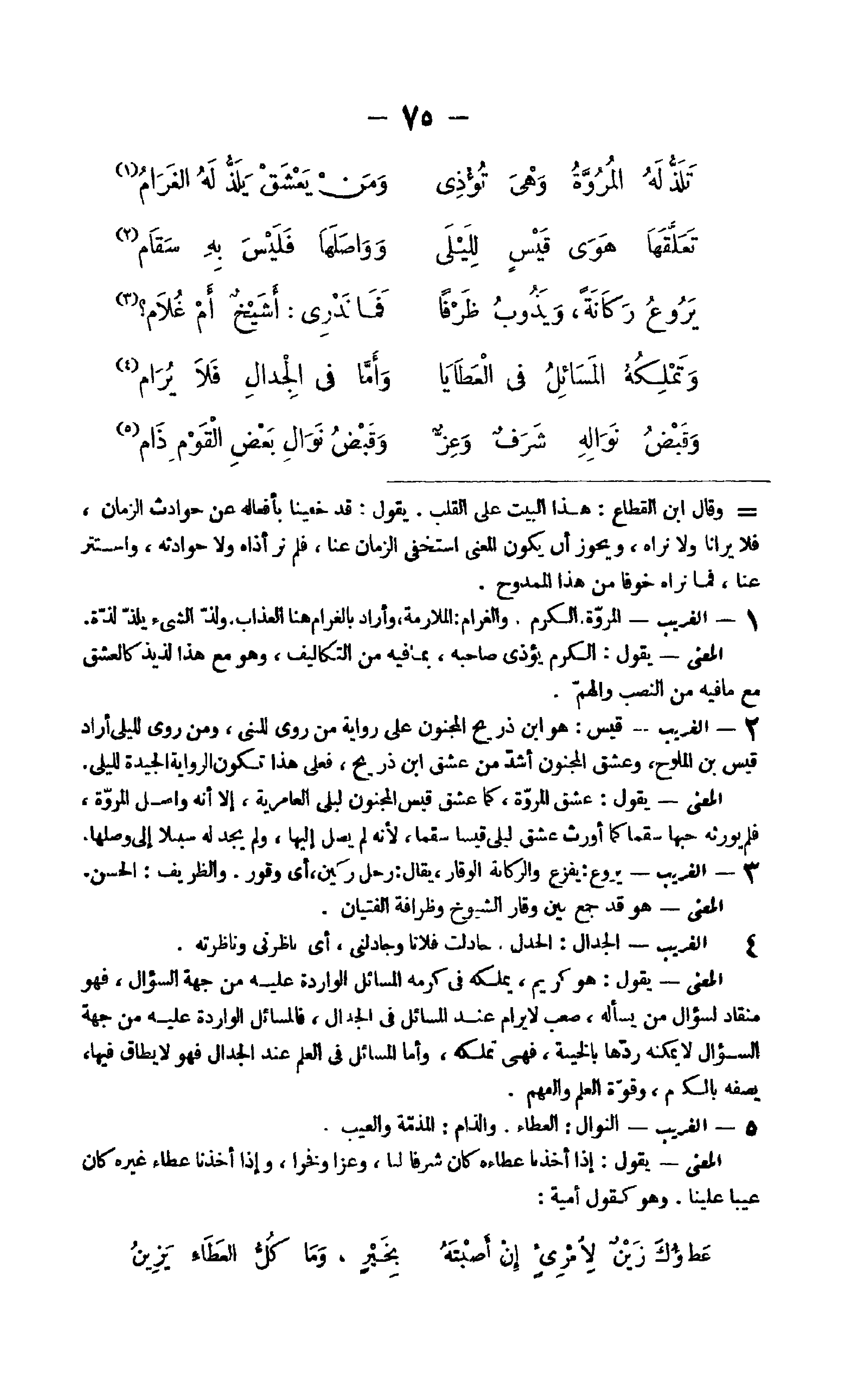 23 - الْغَرِيب الْمَرْوَة الْكَرم والغرام الْمُلَازمَة وَأَرَادَ بالغرام هُنَا الْعَذَاب ولذ الشَّيْء يلذ لَذَّة الْمَعْنى يَقُول الْكَرم يُؤْذى صَاحبه بهَا فِيهِ من التكاليف وَهُوَ مَعَ هَذَا لذيذ كالعشق مَعَ مَا فِيهِ من النصب والهم