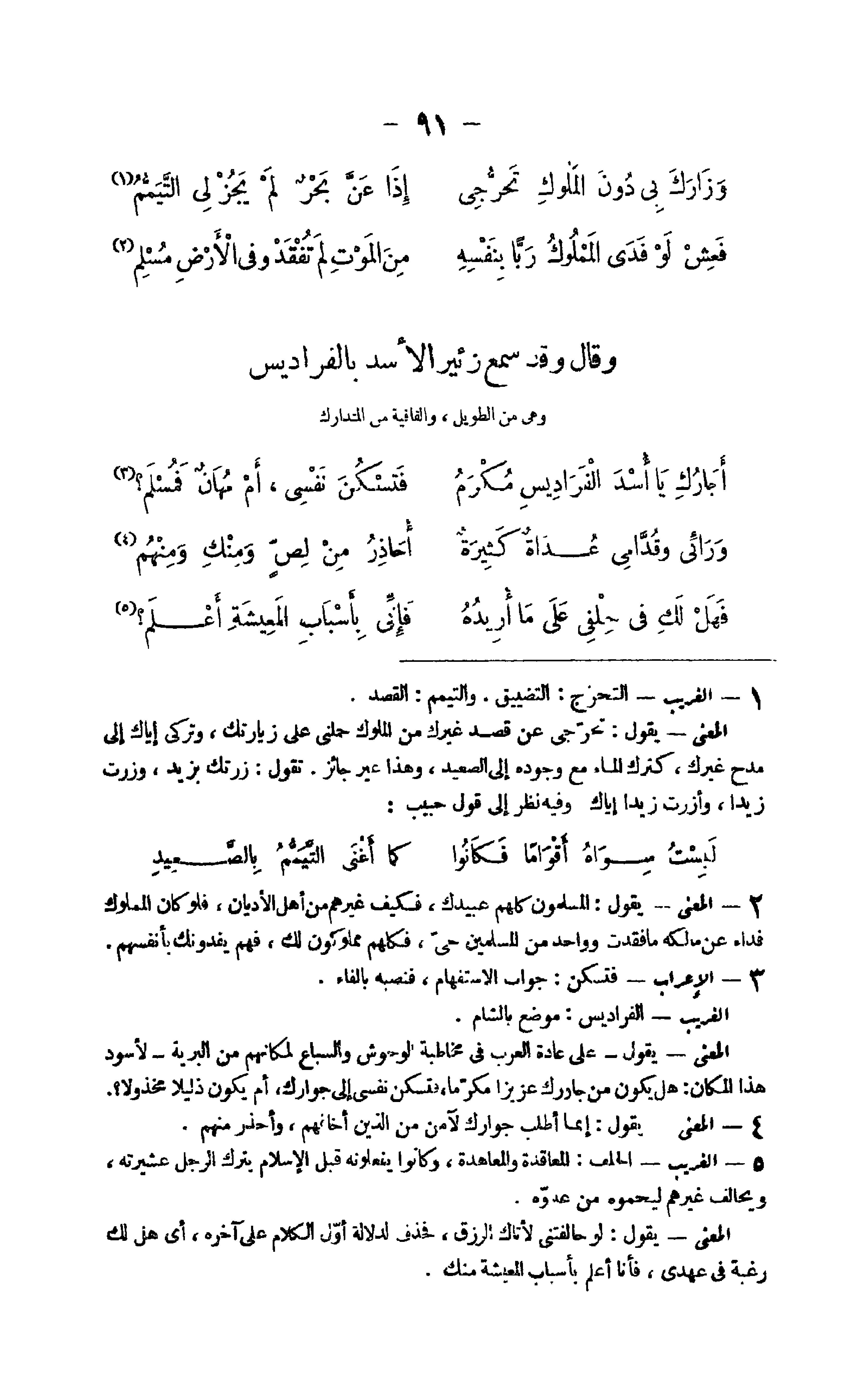 - 1 الْإِعْرَاب فتسكن جَوَاب الِاسْتِفْهَام فنصبه بِالْفَاءِ الْغَرِيب الفراديس مَوضِع بِالشَّام الْمَعْنى يَقُول على عَادَة الْعَرَب فِي مُخَاطبَة الوحوش وَالسِّبَاع لِمَكَانِهِمْ من الْبَريَّة لأسود هَذَا الْمَكَان هَل يكون من جاورك عَزِيزًا مكرما فتسكن نَفسِي إِلَى جوارك أم يكون ذليلا مخذولا