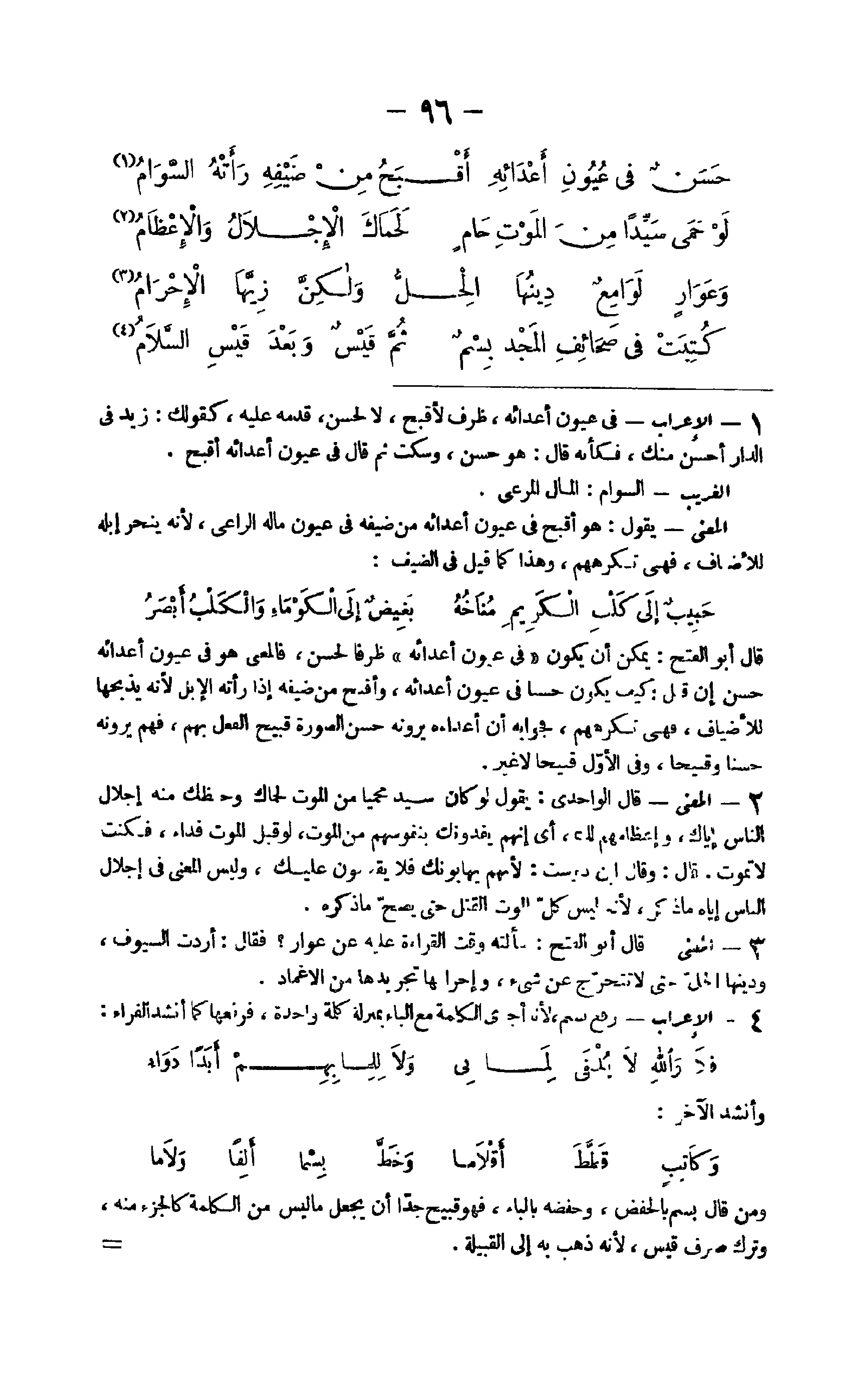 - الْإِعْرَاب فِي عُيُون أعدائه ظرف لأقبح لَا لحسن قدمه عَلَيْهِ كَقَوْلِك زيد فِي الدا أحسن مِنْك فَكَأَنَّهُ قَالَ هُوَ حسن وَسكت ثمَّ قَالَ فِي عُيُون أعدائه أقبح الْغَرِيب السوام المَال المرعى الْمَعْنى يَقُول هُوَ أقبح فِي عُيُون أعدائه من ضَيفه فِي عُيُون مَاله الرَّاعِي لِأَنَّهُ ينْحَر إبِله للأضاف فَهِيَ تكرههم وَهَذَا كَمَا قيل فِي الضَّيْف