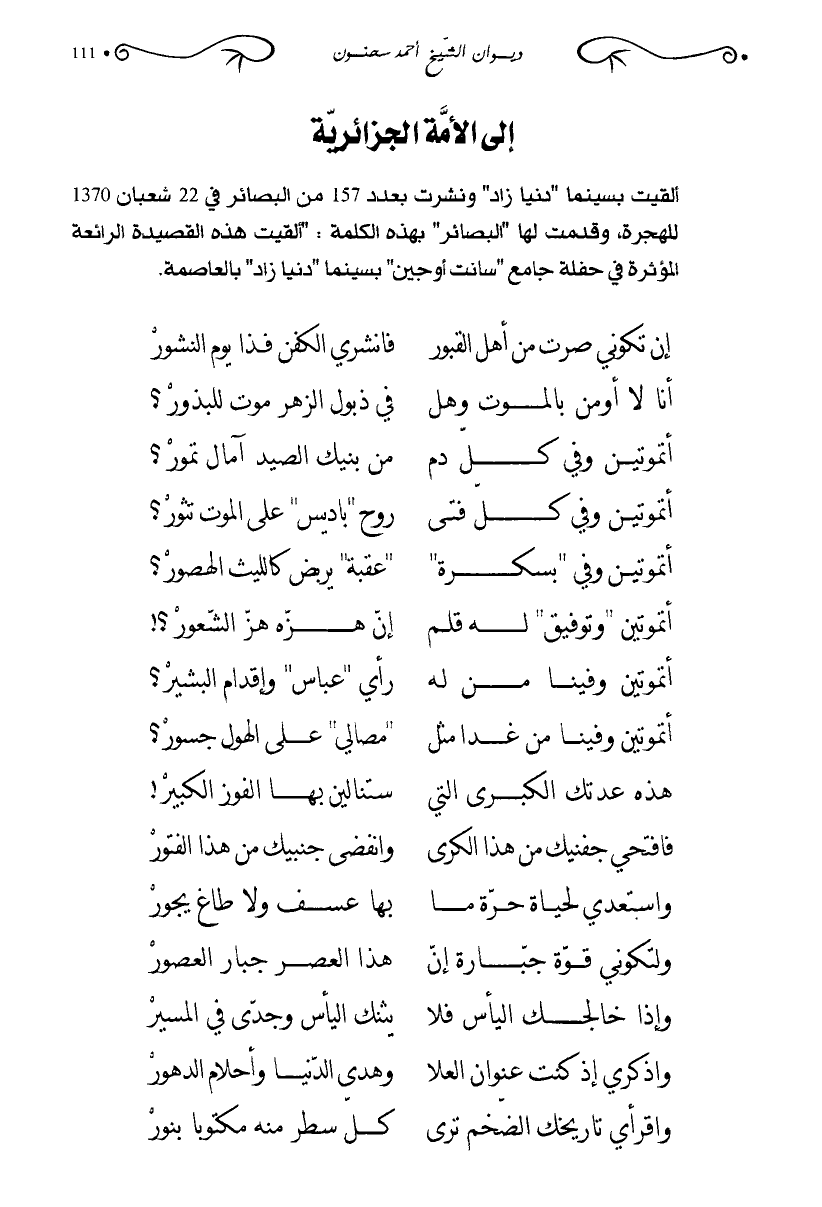 ألقيت بسينما "دنيا زاد" ونشرت بعدد 157 من البصائر في 22 شعبان 1370 للهجرة، وقدمت لها "البصائر" بهذه الكلمة: "ألقيت هذه القصيدة الرائعة المؤثرة في حفلة جامع "سانت أوجين" بسينما "دنيا زاد" بالعاصمة.