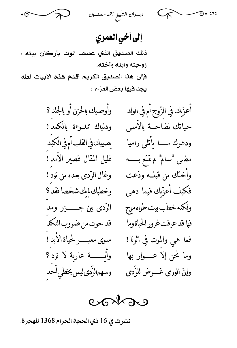 فإلى هذا الصديق الكريم أقدم هذه الأبيات لعله يجد فيها بعض العزاء: