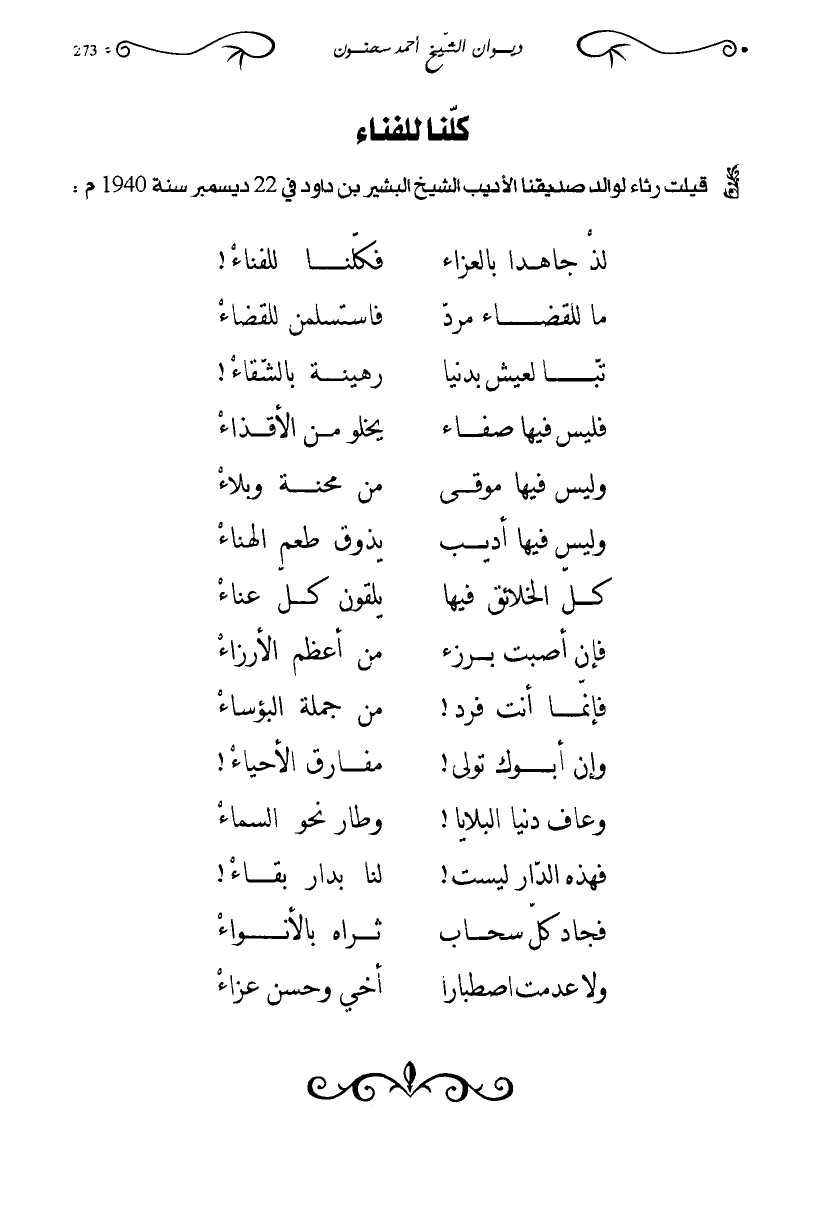 قيلت رثاء لوالد صديقنا الأديب الشيخ البشير بن داود في 22 ديسمبر سنة 1940م: